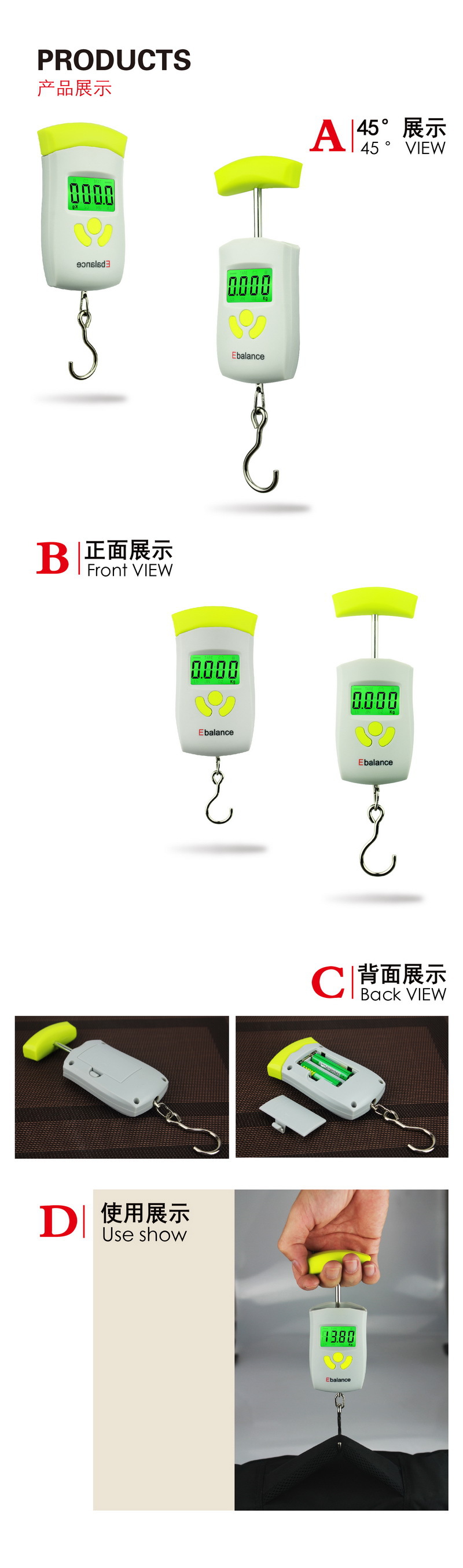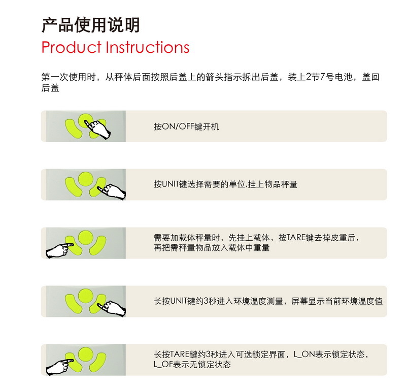 2、 Please hold the hook or add auxiliary tools to the hook for weighing, do not hold the shell for weighing, otherwise it will lead to an error in the display value exceeding the standard.