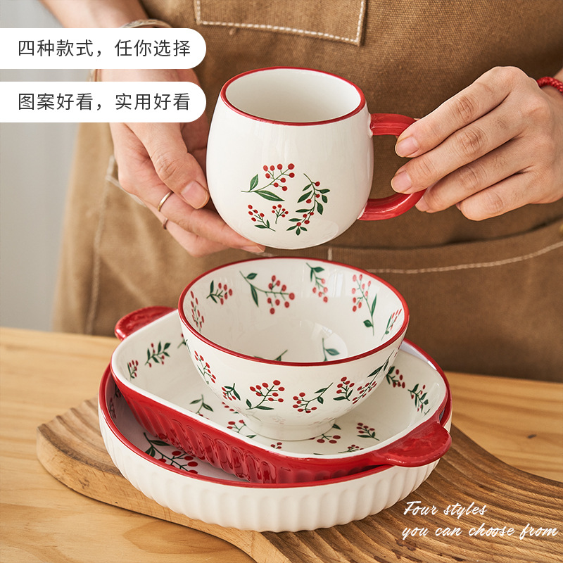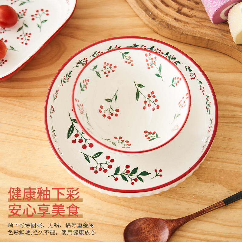 ceramic tableware red berry series fresh homemade underglaze microwaveable ceramic rice bowl plate cup suit