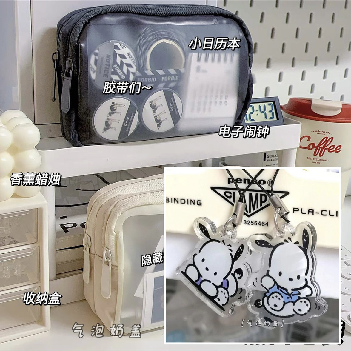 frosted white double layer pencil case; + pacha dog pendant