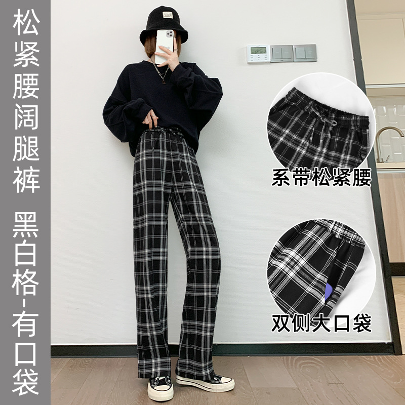 black and white plaid-elastic waist wide leg-with pockets: l suitable for 53.00 kg-57.50 kg