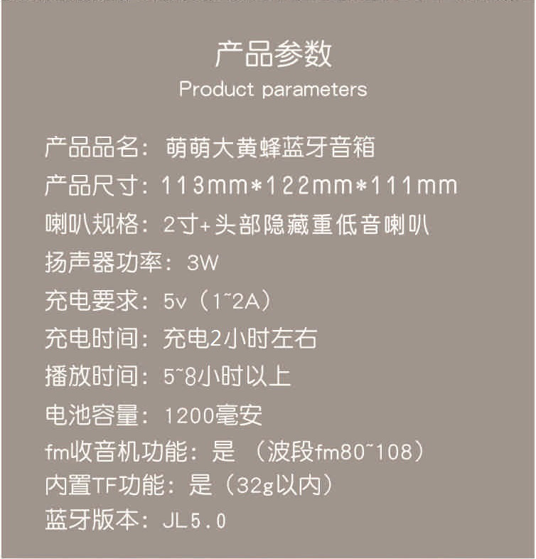 package content: bumblebee Bluetooth speaker, charging cable, Chinese and English Manual, neutral color box