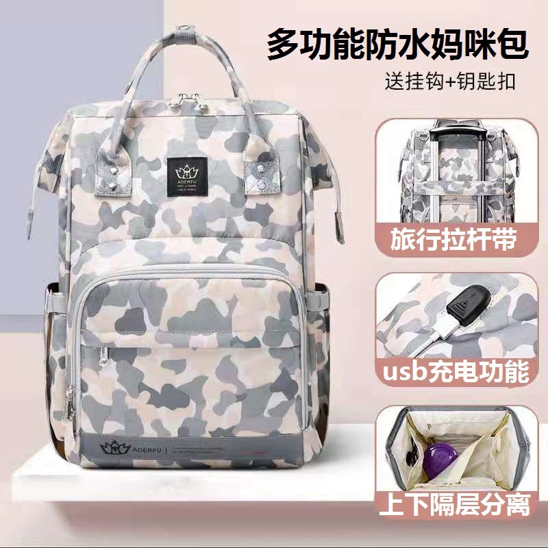 Mummy Bag Backpack Handbag Large Capacity Multi-Functional Mummy Bag Camouflage Mother and Baby Bag Usb Mother Bag