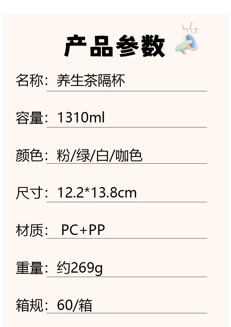 Volume (ml): 1100 Cup body: PC Lid: PP Size (cm): 12.2*13.8*17.2 Packing: Sandblasted Bag Packing: 60/case |