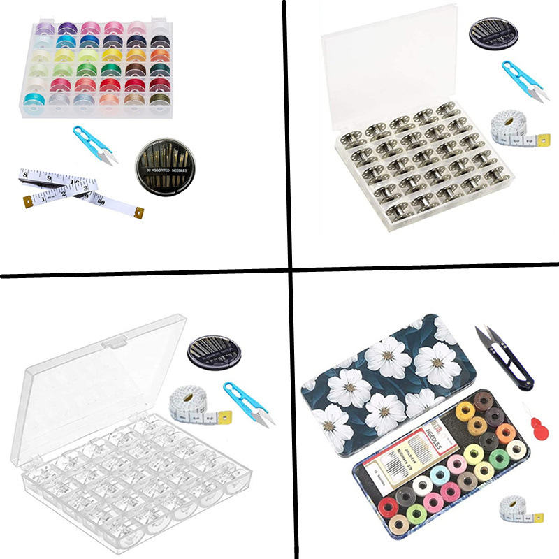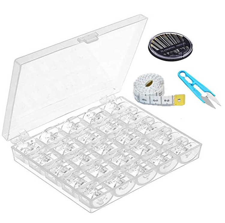25 plastic bobbin boxes + plastic scissors + needles + measuring tape, packaging: appearance size -- about 13cm X width 10.5cm X height 2.5cm, weight 156g