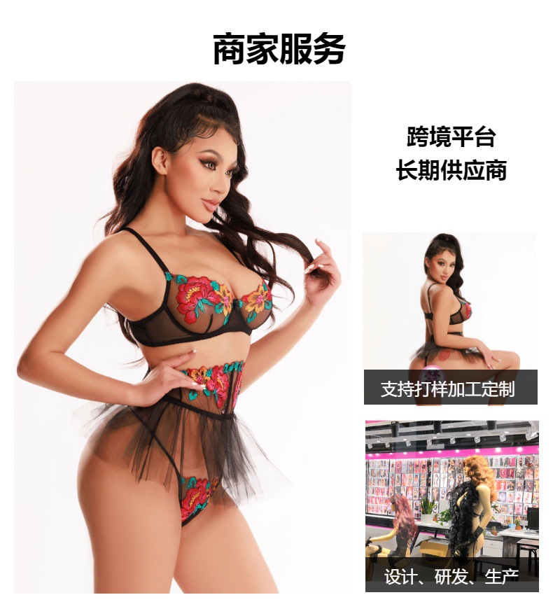 European and American Sexy Three-Point Sexy Lingerie Embroidery Average Size Bra Set Transparent Tempting 3-Piece Set 8133