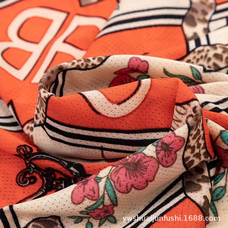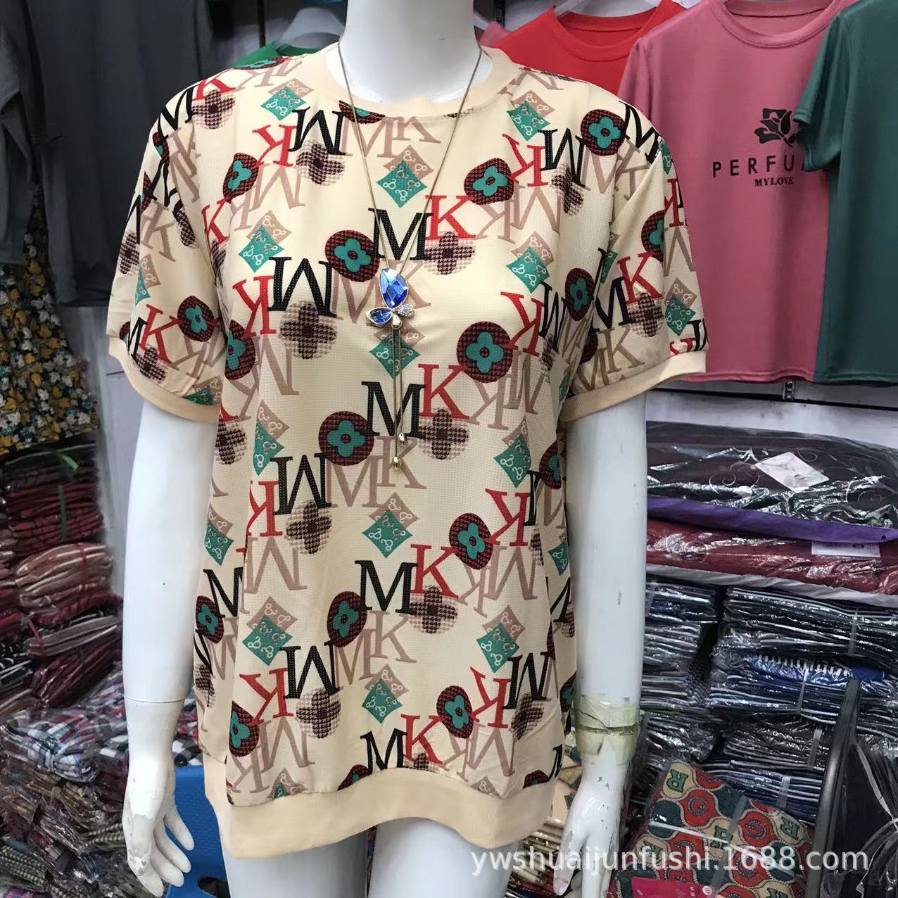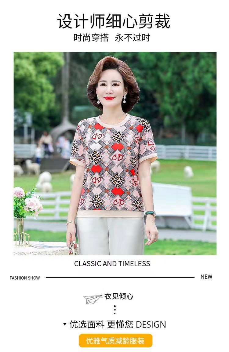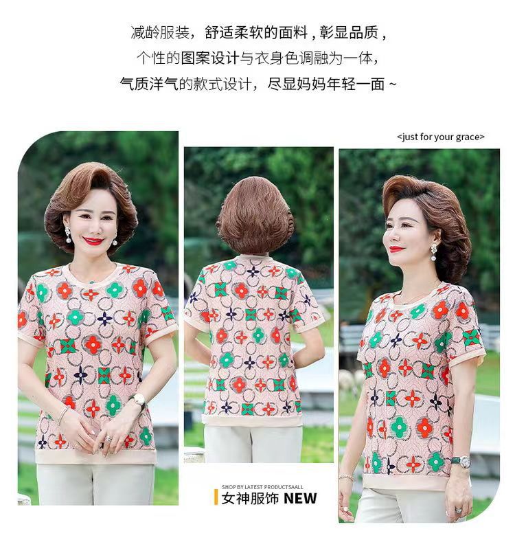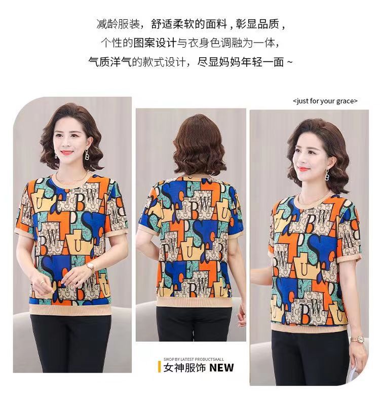 Summer New Women's Ice Silk Short Sleeve Printed Top round Neck Printed Loose Blouse Middle-Aged and Elderly Women's Dress Younger