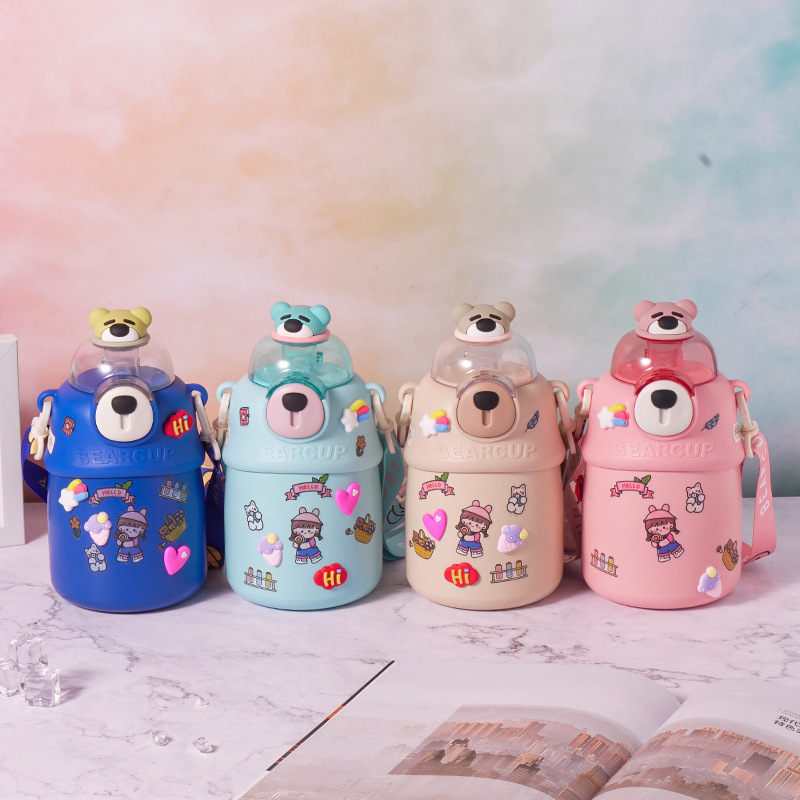 Creative Design Bear Water Cup Factory Wholesale Children's Cartoon Stickers Big Belly Cup Summer Cooling Belt Straw Cup
