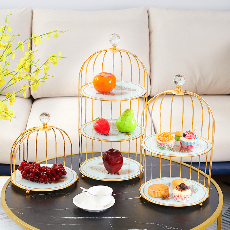 european-style iron birdcage cake rack double-layer glass dessert table cosmetics storage box dressing table storage rack