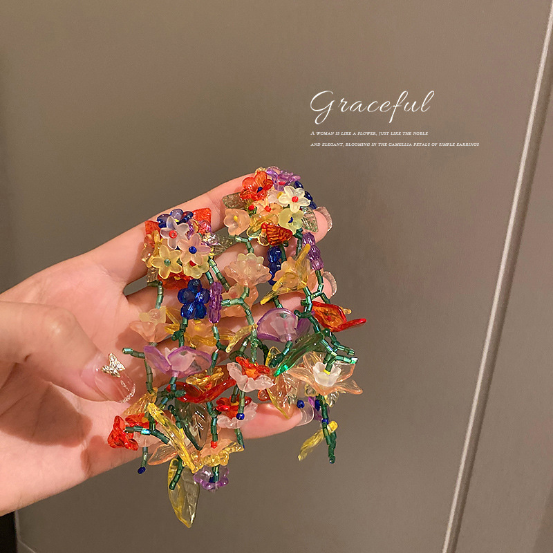 925 Silver Needle Tassel Flower Flower Fairy Style Earrings Female Pastoral Style Niche Handmade Exaggerated Earrings Female