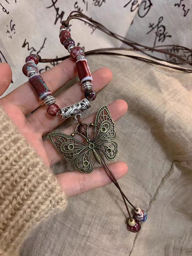 New Chinese Ethnic Style ~ Ceramic Butterfly Long Necklace Bell 2023 New Retro Clavicle Chain Accessories Women