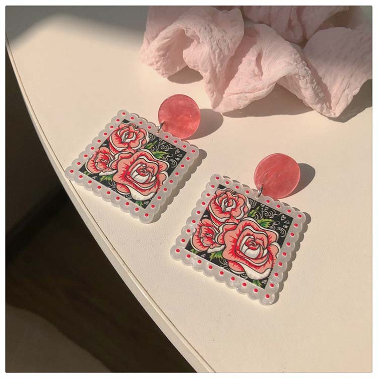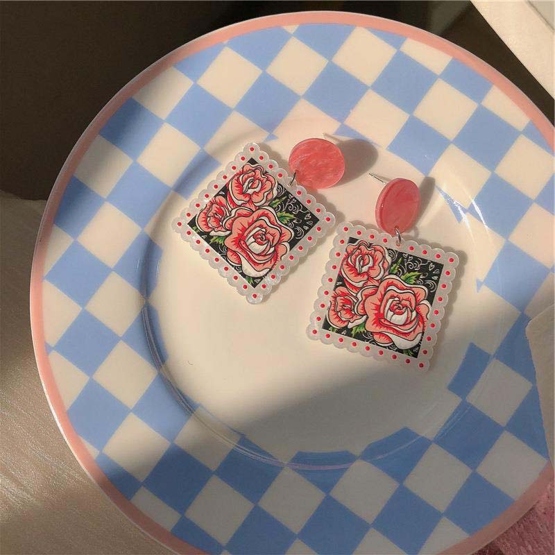 Silver Needle Acrylic Printed Square Earrings Korean Style Dongdaemun Retro Personalized Earrings Minority All-Match Fashion Earrings