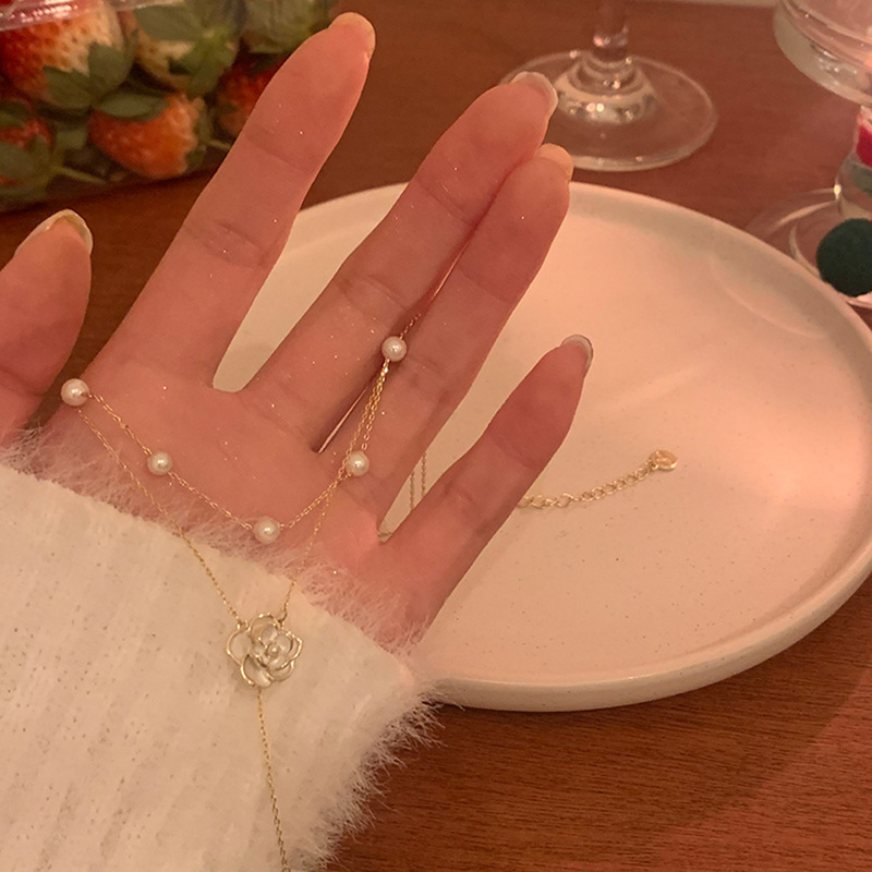 Pearl Camellia Double-Layer Necklace Fashion Design Affordable Luxury Style Clavicle Chain Personality Simple New Necklace Wholesale Female