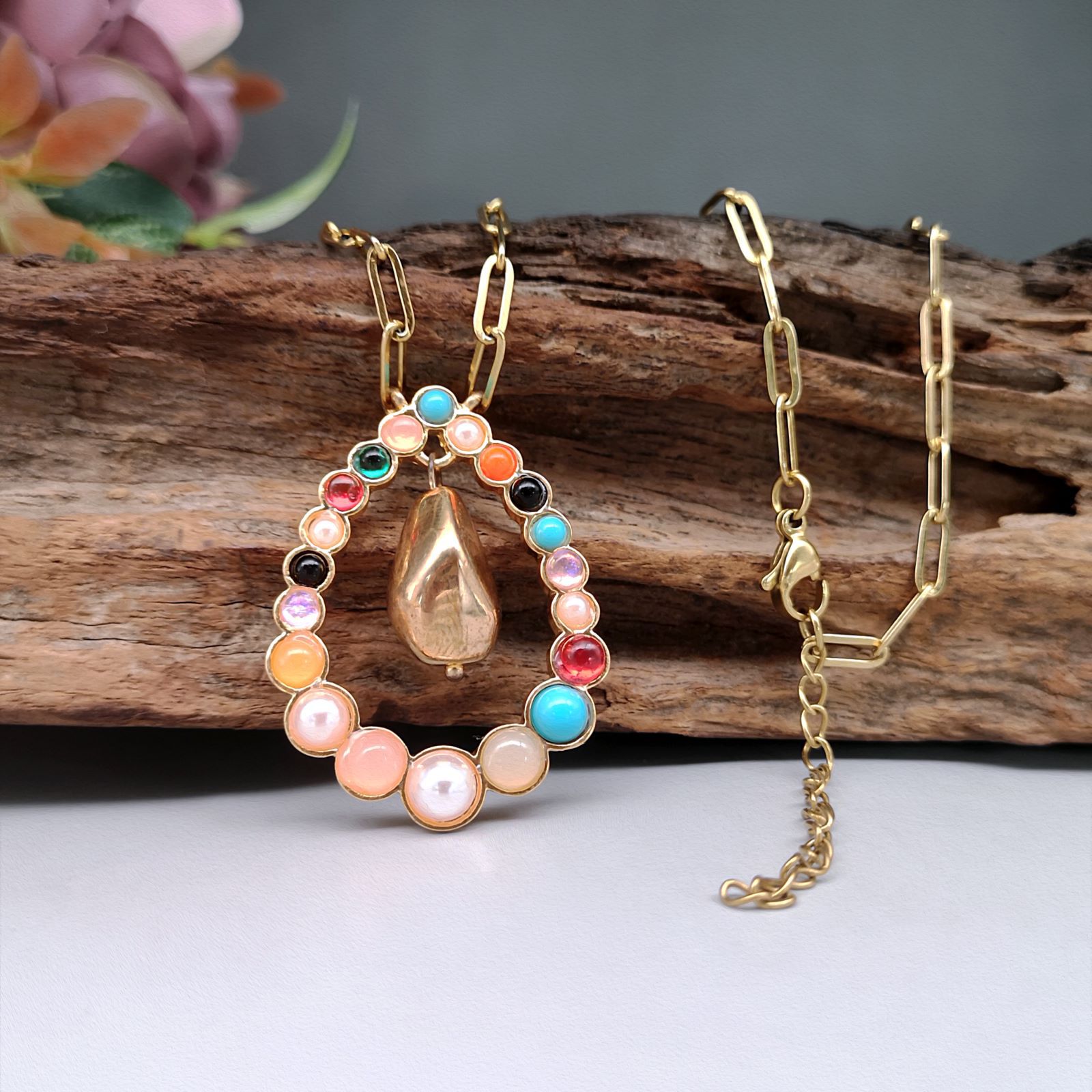 Product material and color: Alloy, synthetic gemstones, stainless steel necklace.