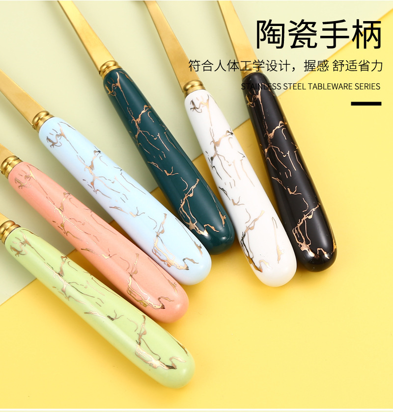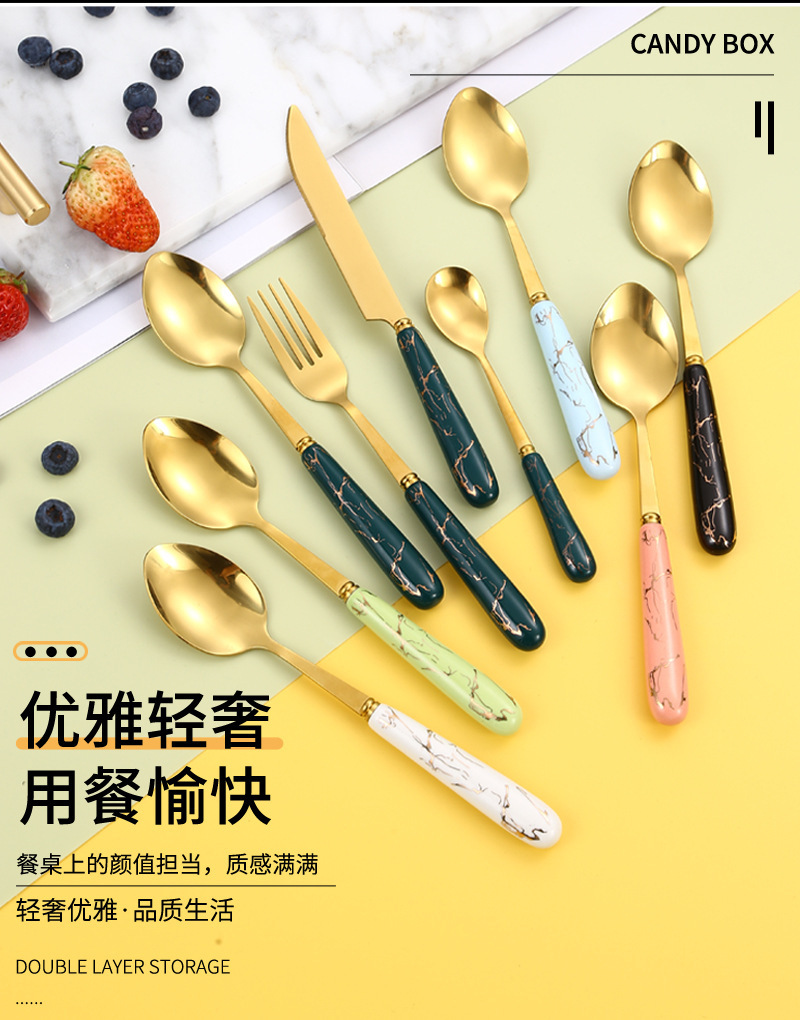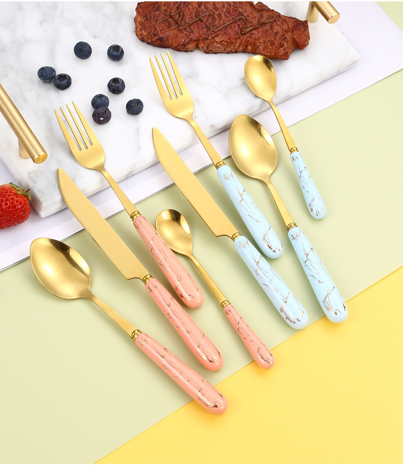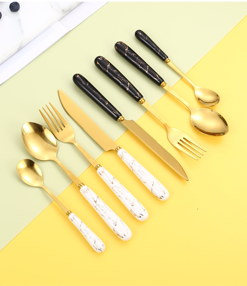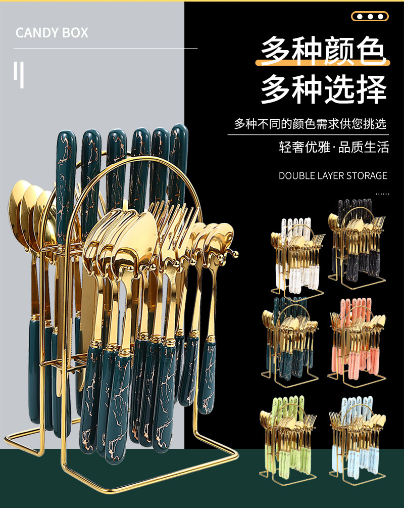 410 Stainless Steel Knife, Fork and Spoon Nordic Marbling Hotel Western Tableware Steak Knife, Fork and Spoon Storage Rack 24-Piece Set