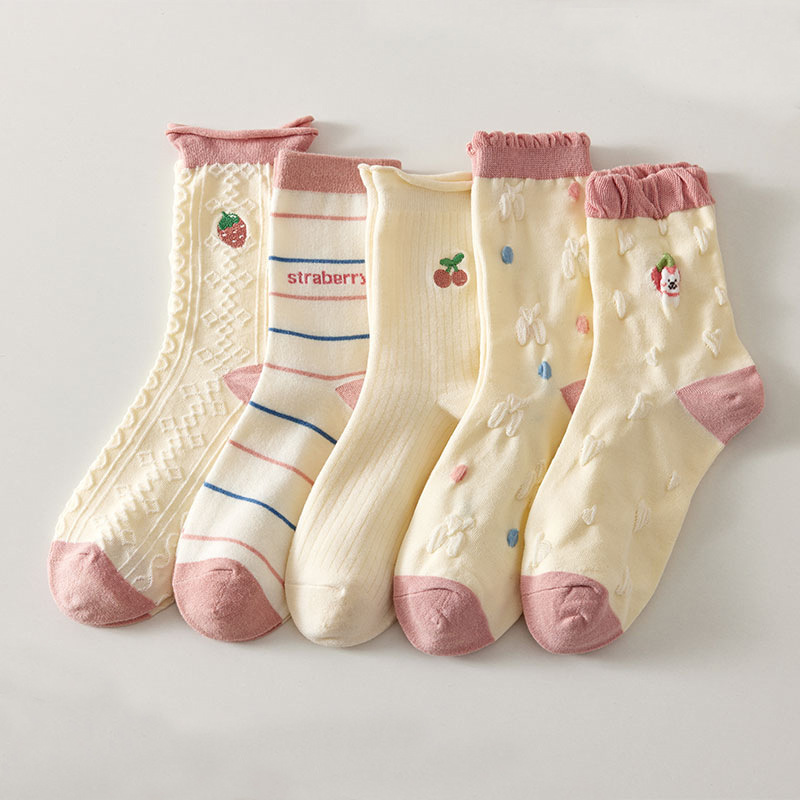 Sweet and Simple Tube Socks Women's Curling Cute Cherry Versatile Preppy Style Vertical Stripe Cotton Socks Breathable Four Seasons Universal Socks