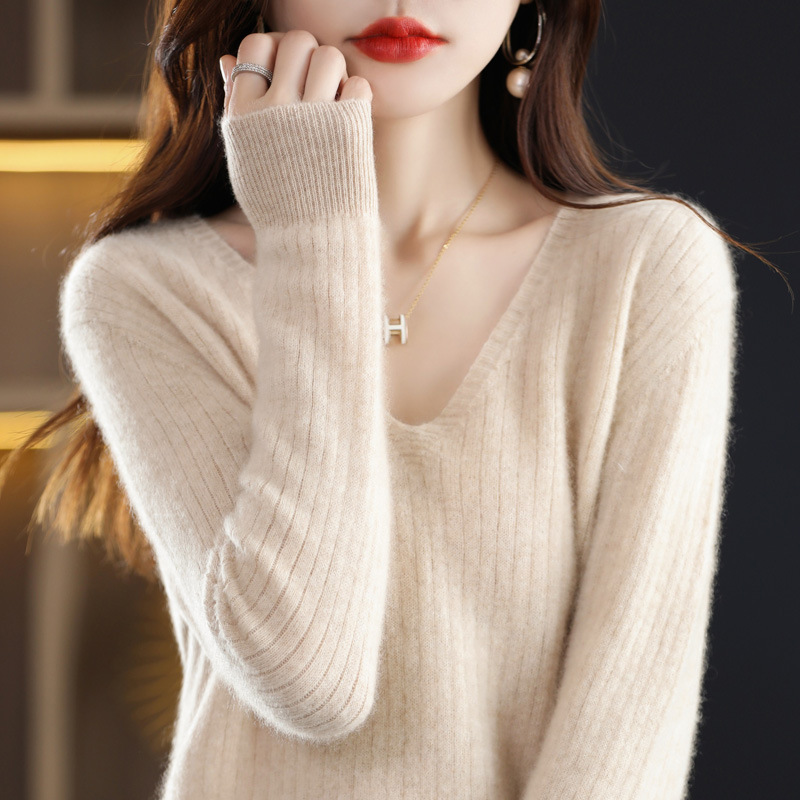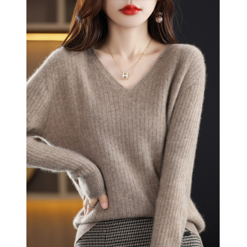 2023 Spring Women's Clothes New Knitwear Pullover V-neck Bedford Cord Sweater Solid Color Long Sleeve Thin Slim Bottoming Shirt
