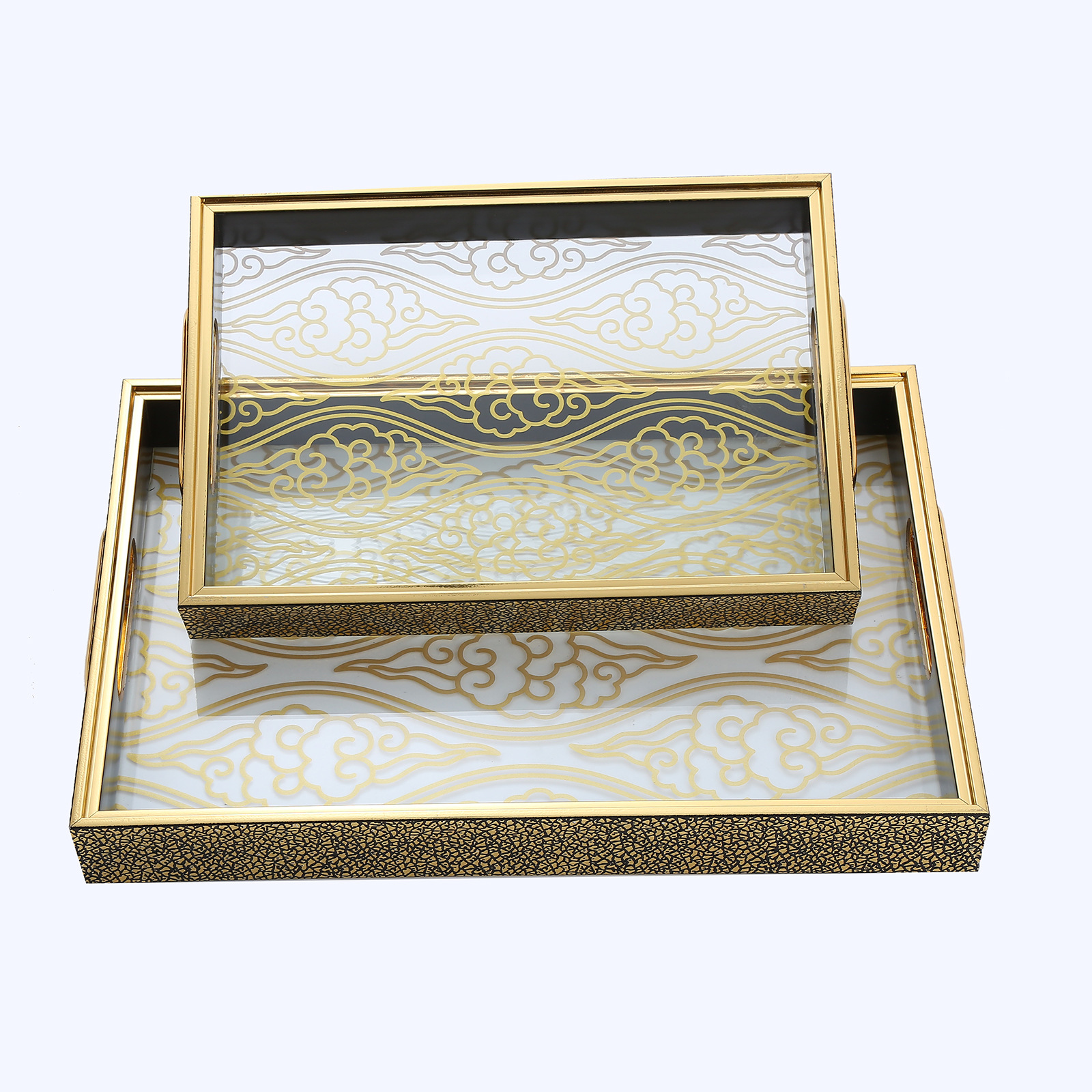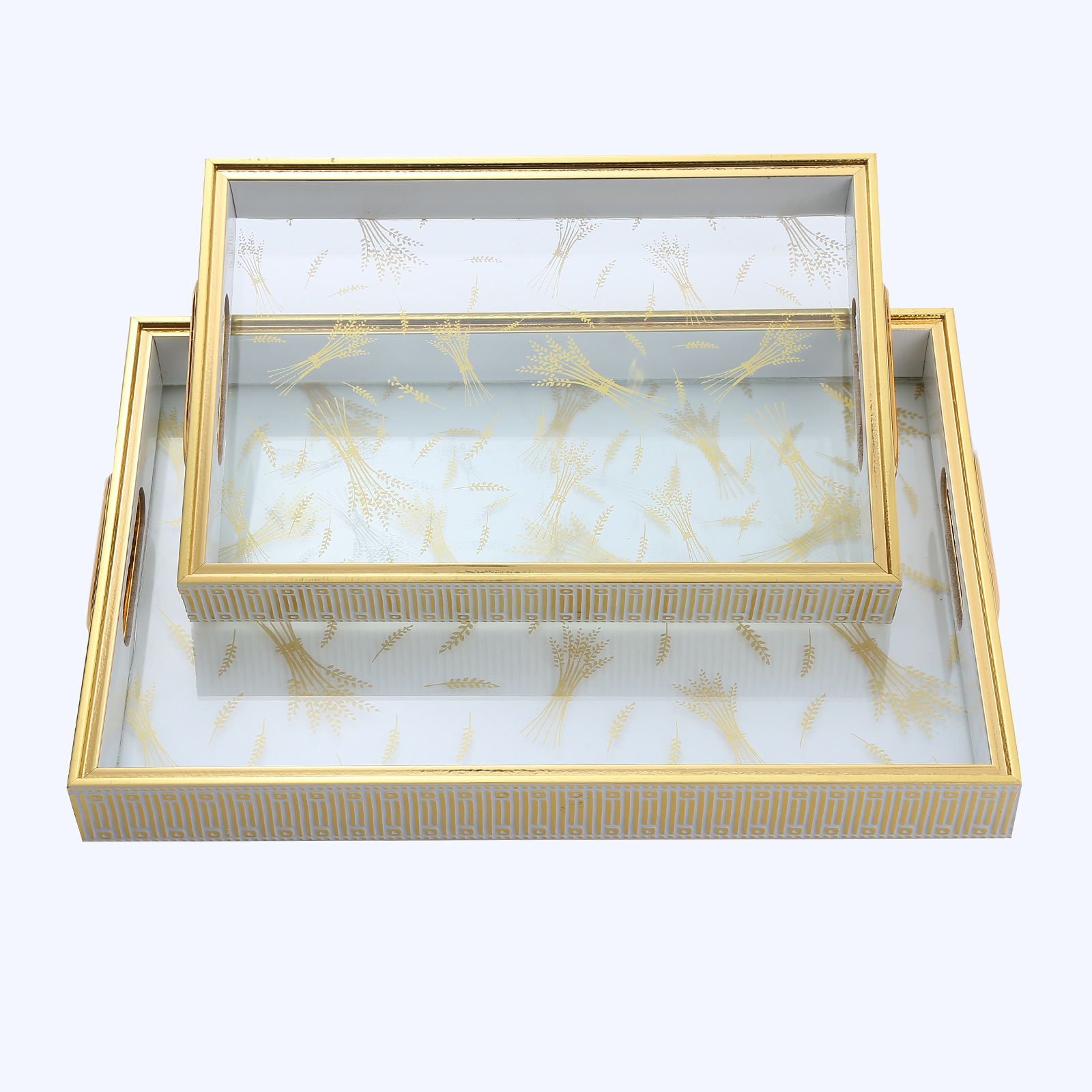 Wood Color Wooden Glass Bottom Tray Spray Painted Gold Silk Glass Tray Two-Piece Set
