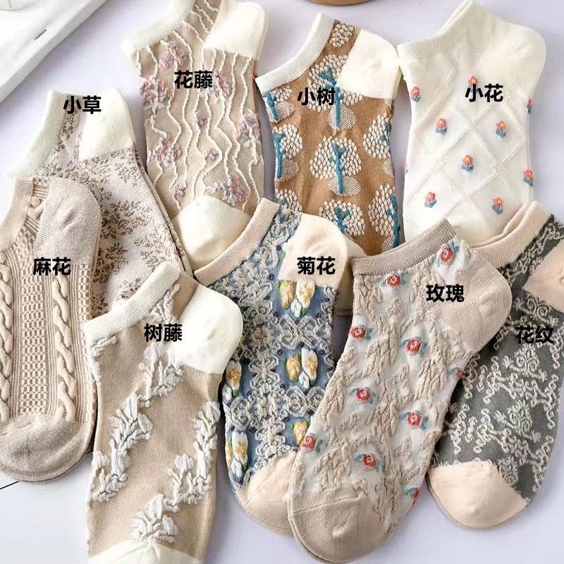 Socks Female Online Influencer Ins Trendy Spring and Summer Solid Color Socks Breathable Retro Floral All-Match Low Top Low Top Socks