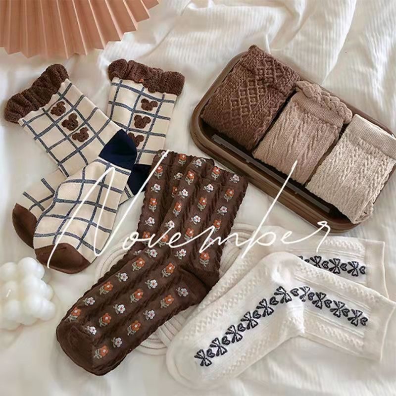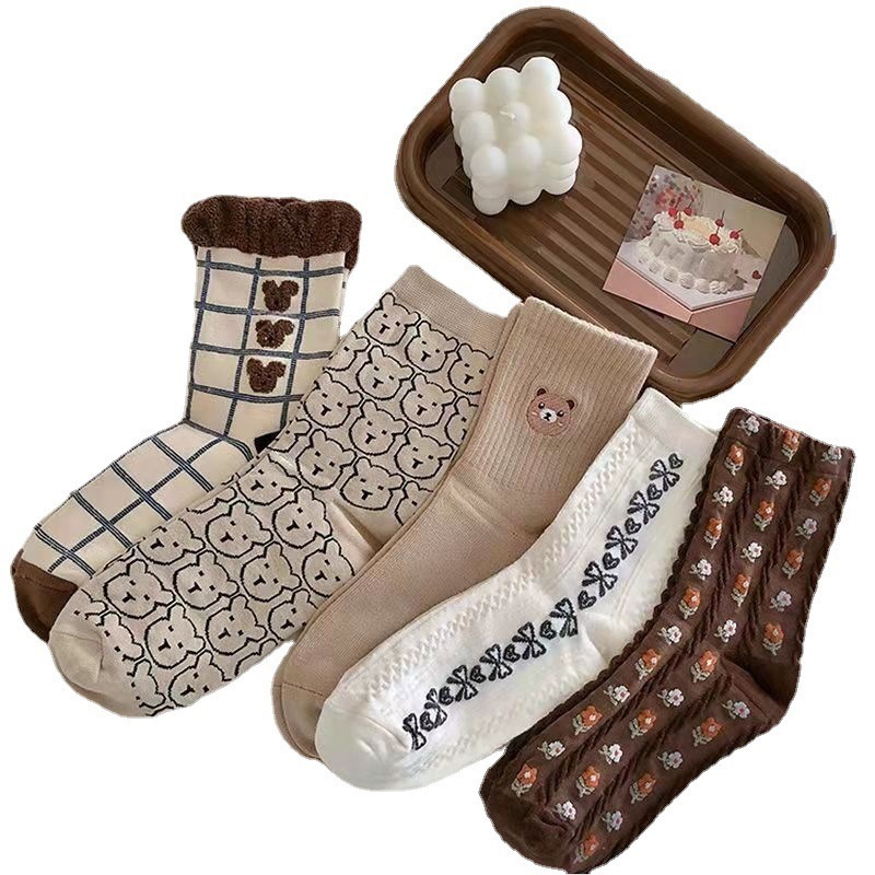 Socks Women's Autumn Earth Color Socks College Style Mid-Calf Length Loose Socks Trendy Ins Japanese Cartoon Animal Coffee Color Long Socks