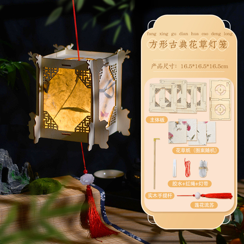 Square Classical Wood Color Flowers and Plants Lantern (Free Lifting Rod + High-Grade Electronic Lamp + Tassel)