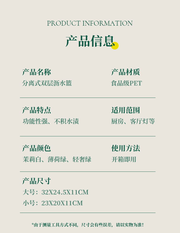 【Product Color】: White, Green, Mint Green 【Product Size】: Small 23.2*20*11.3cm, Large 33*25*11.3cm 【Product Material】:PET+ABS 【Packing Method】:PE Bag 【Packing Quantity】: Small Size: 30 pieces/box, Large Size: 24 pieces/box 【Packing Method】: Color and Style Clear Packing 【Crate Size】: Small 61.5*48.5*45.5:"CM, Large Size 65.5*50.5*50cm 【Whether custom processing is available】: No Note: The goods will be shipped within 3-7 days after the order is placed. If you need it urgently, please contact our customer service to inquire about the delivery schedule to see if it is possible to place an order in time. |