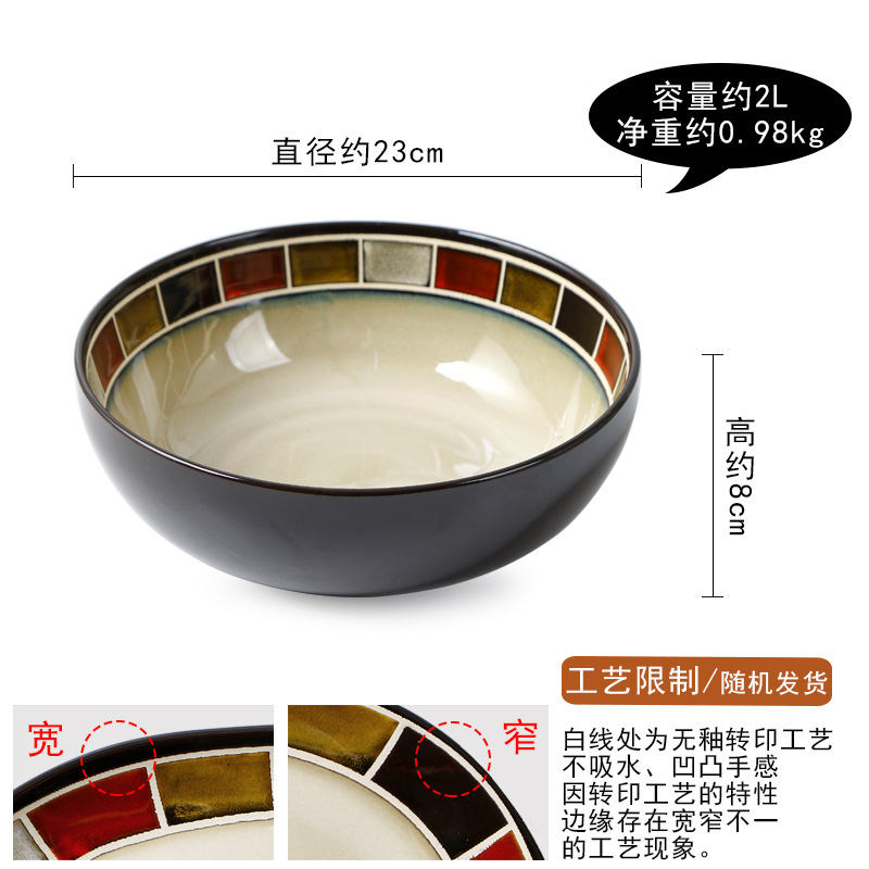 9-inch Large Soup Bowl: Diameter: 23cm, Height: 8.3cm, Capacity: 2L, Net Weight: 1kg, Packed Quantity: 10 pieces per box