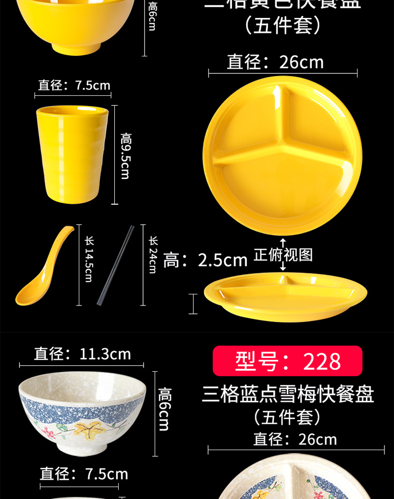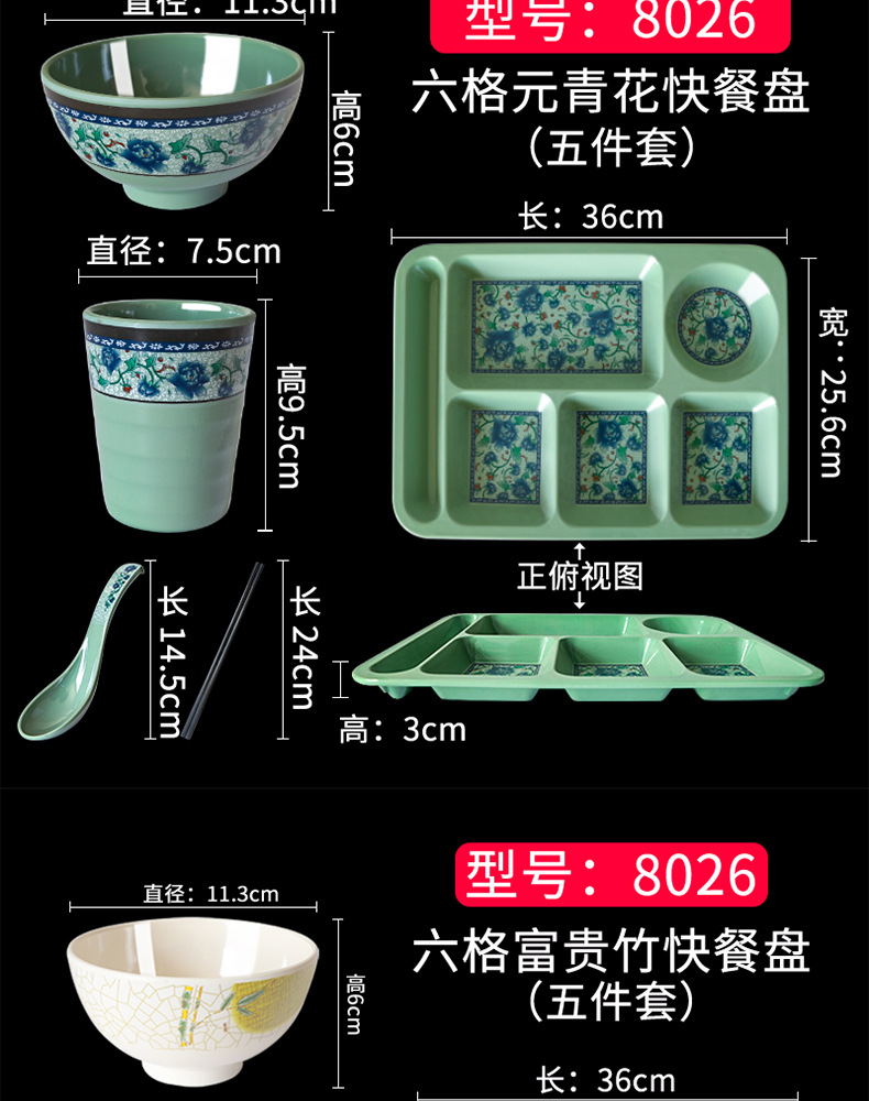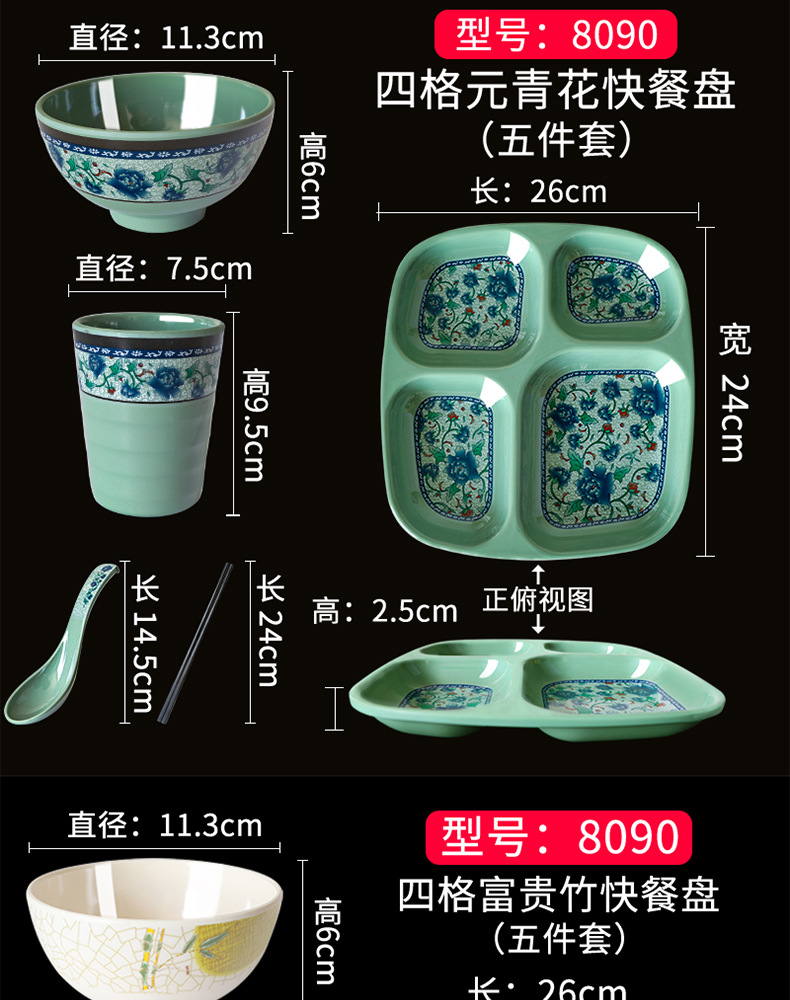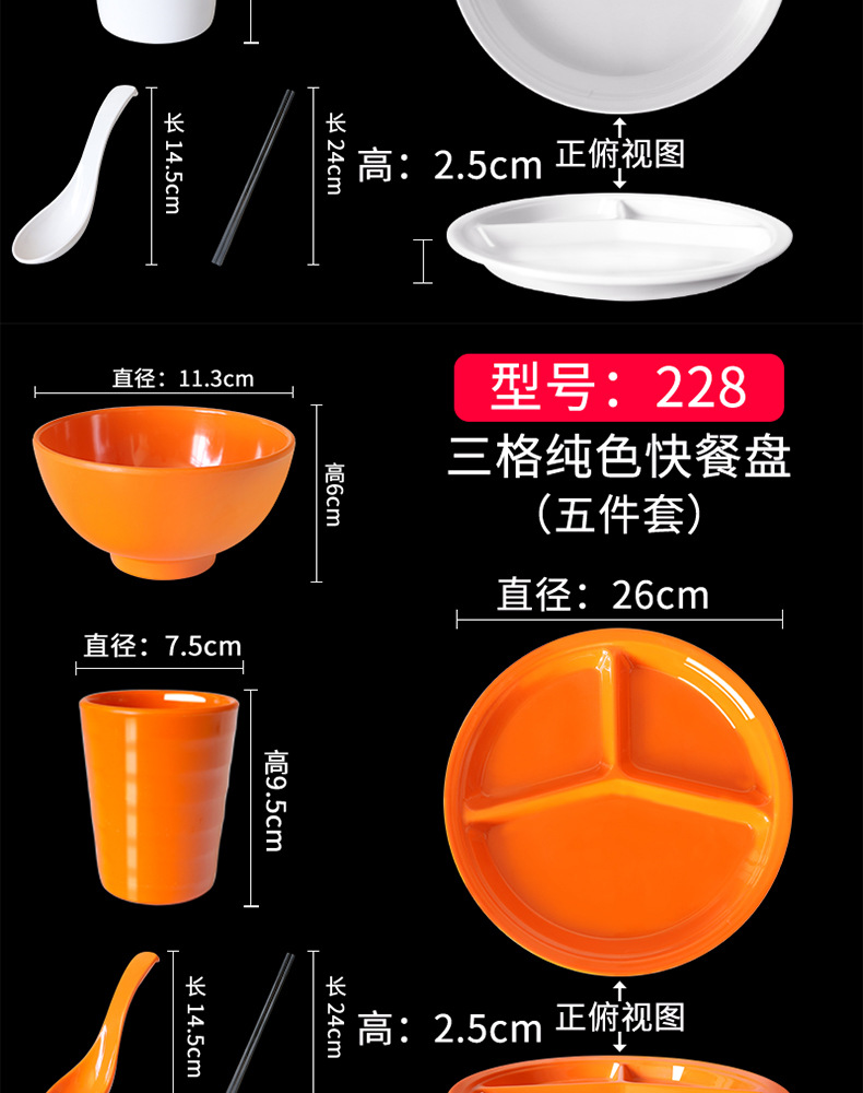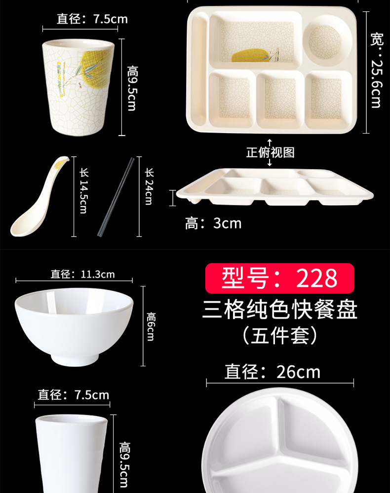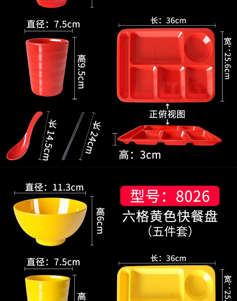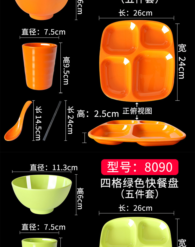 Fast Food Plate Grid Plate Commercial Plastic Melamine Tableware Rectangular Drop-Resistant Six Grid Canteen School Grid Meal Tray