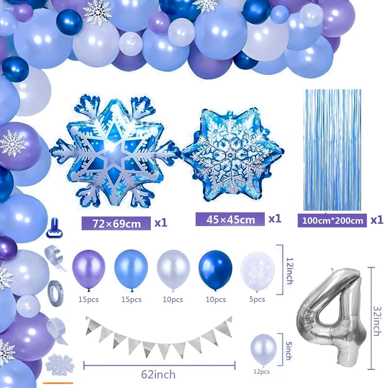 One large snowflake, one medium snowflake, one small snowflake, one silver triangle flag, and one silver number.