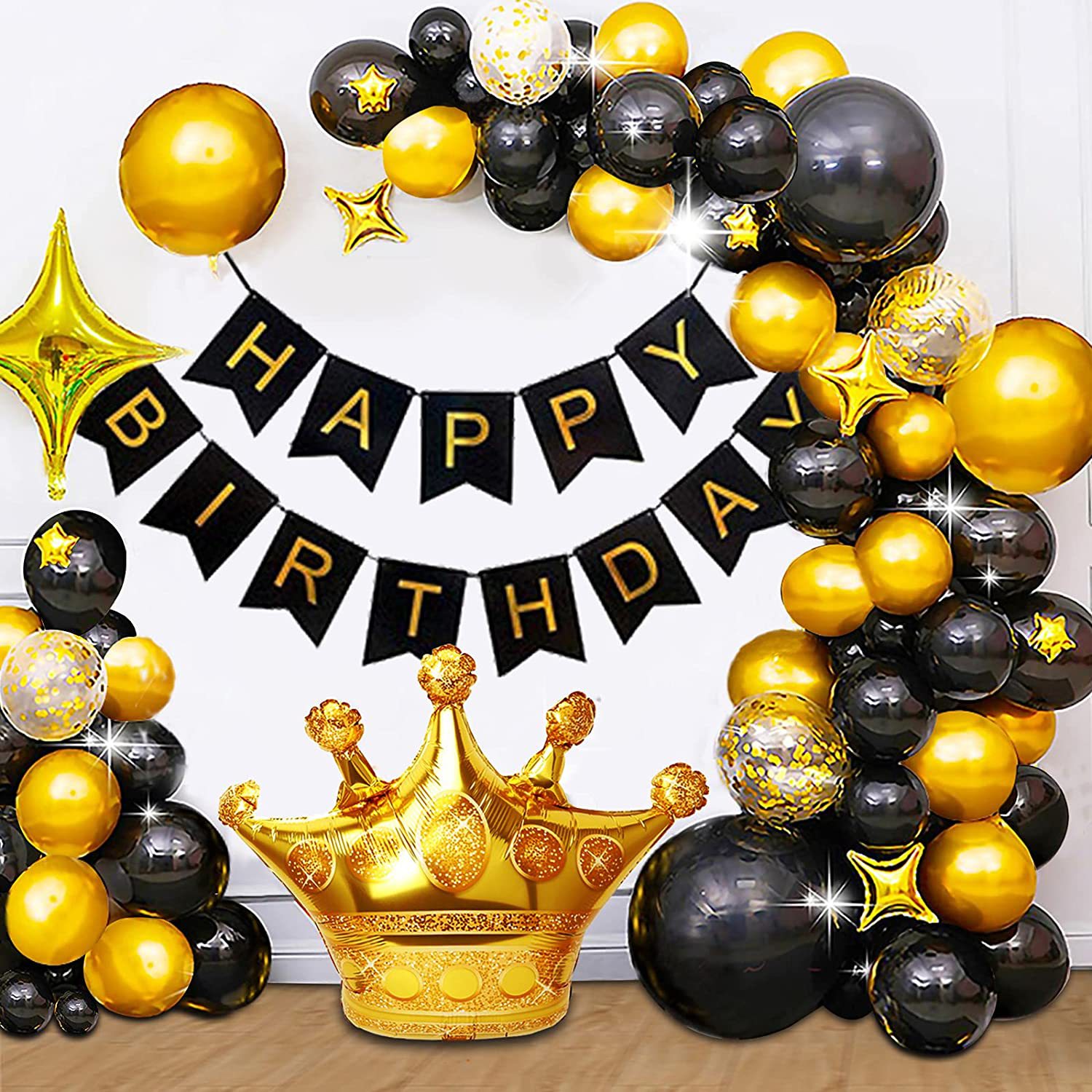 3 pieces of 5-inch pentagonal stars,12-inch black latex, 29 pieces; golden latex, 21 pieces; 12-inch golden sequins, 5 pieces.Dot adhesive 1 sheet, ribbon 1 piece