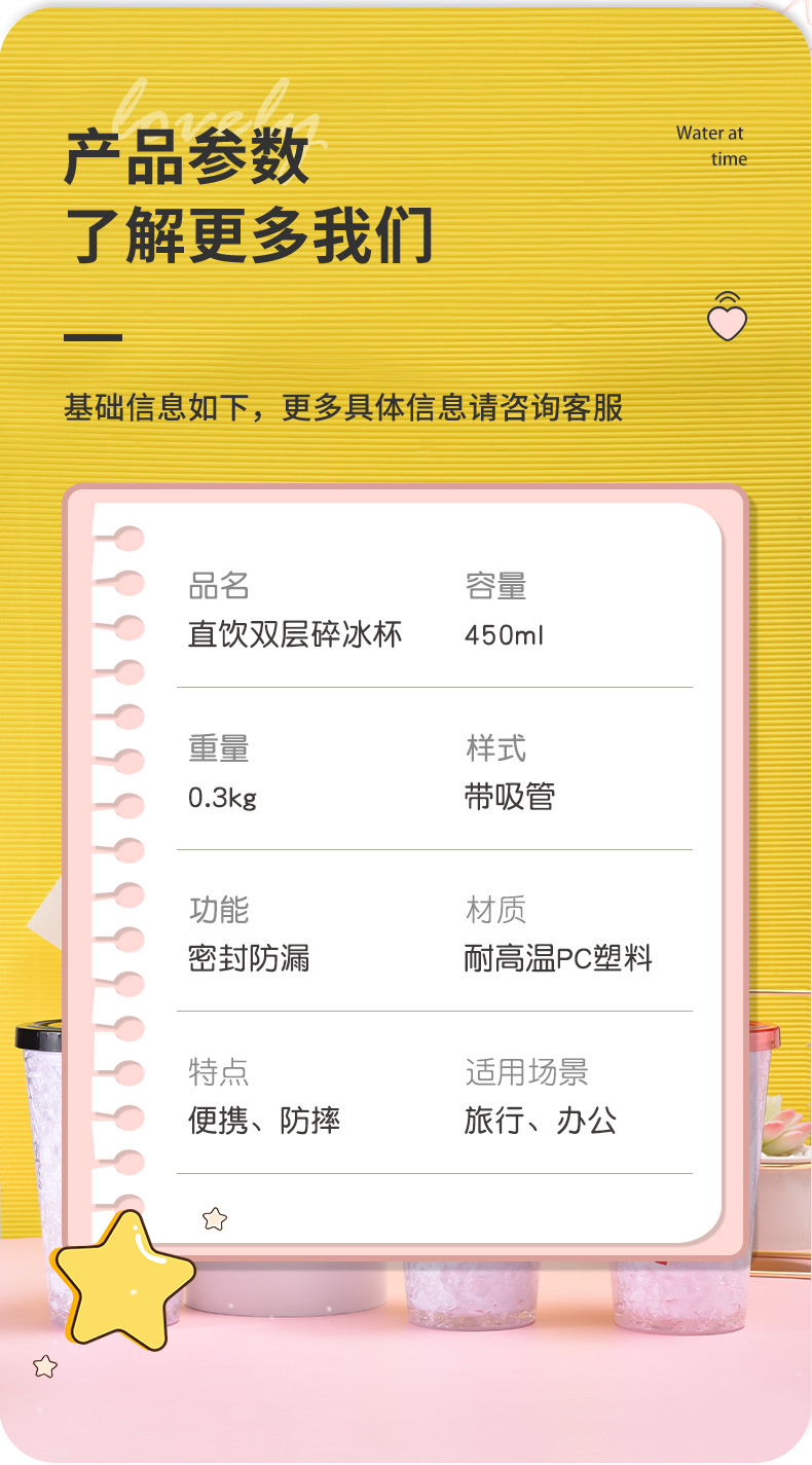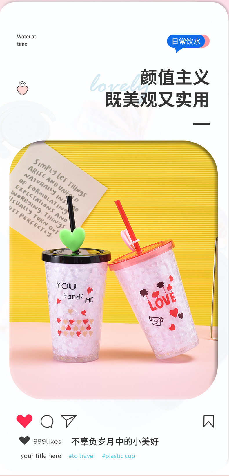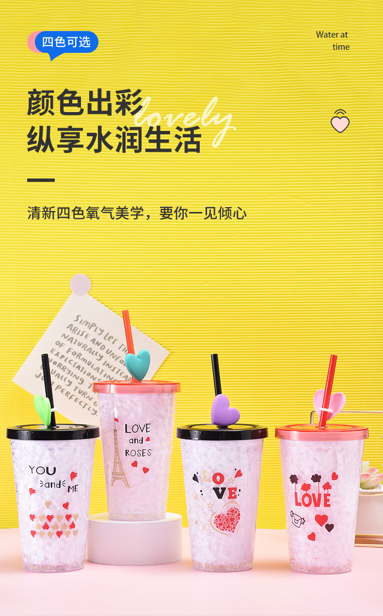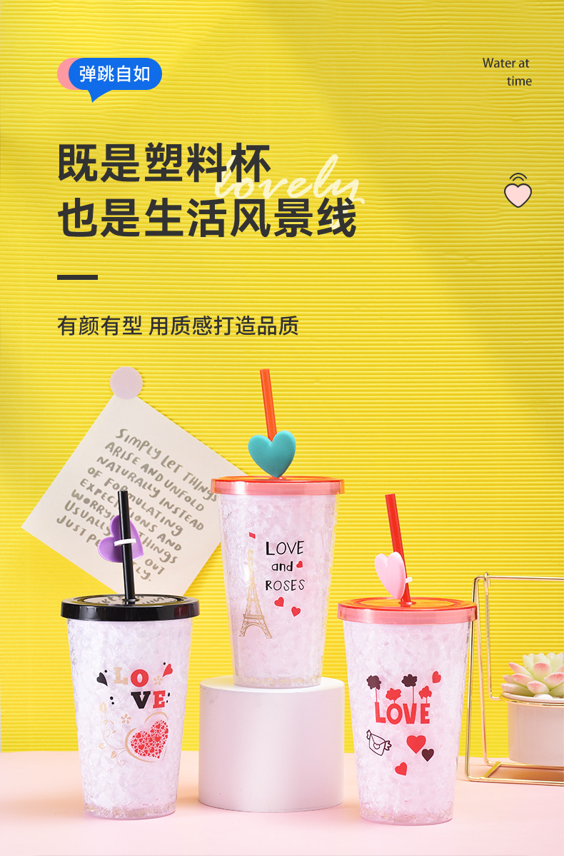 double layer plastic cup couple love straw water cup summer outdoor crushed ice cup cartoon straw ice cool cup