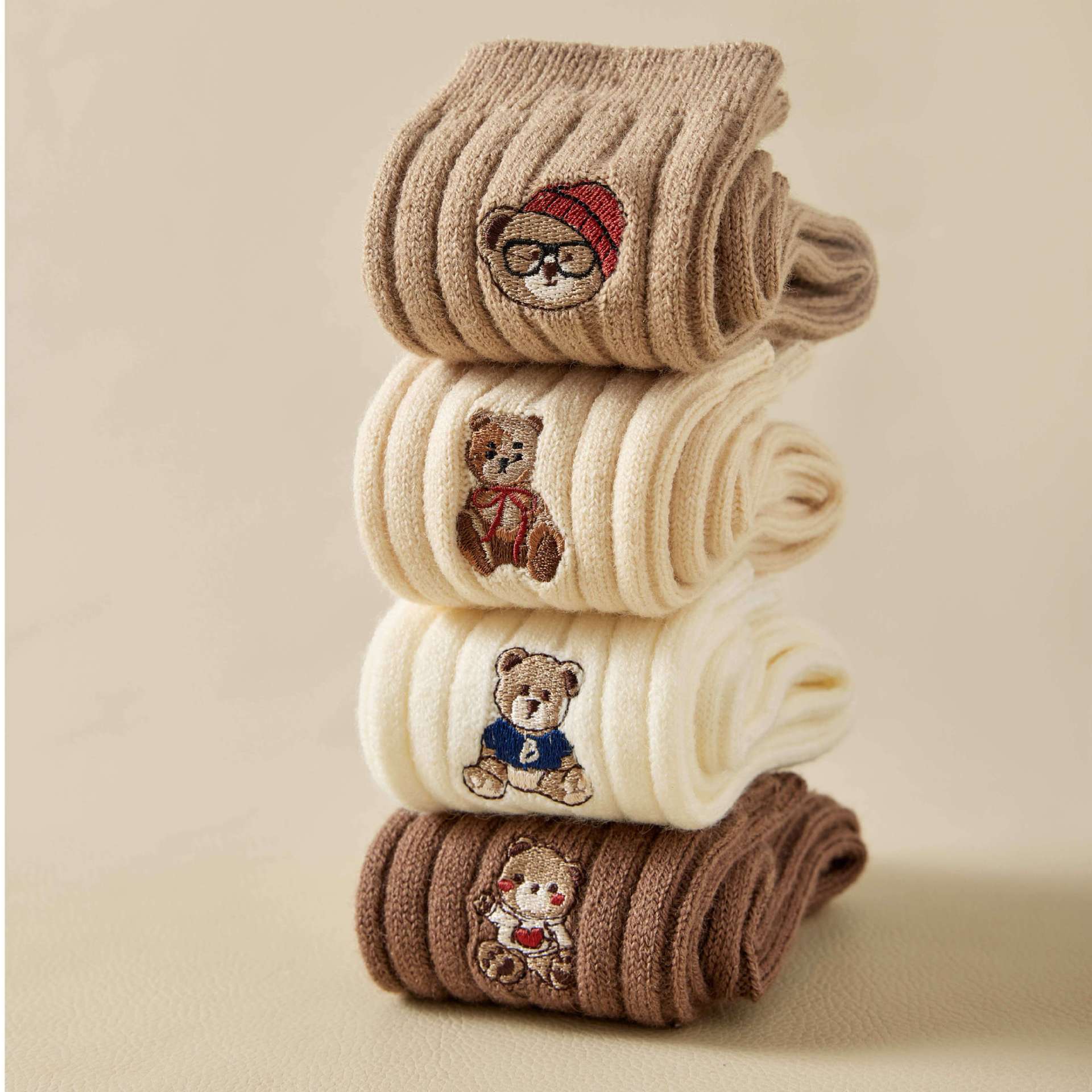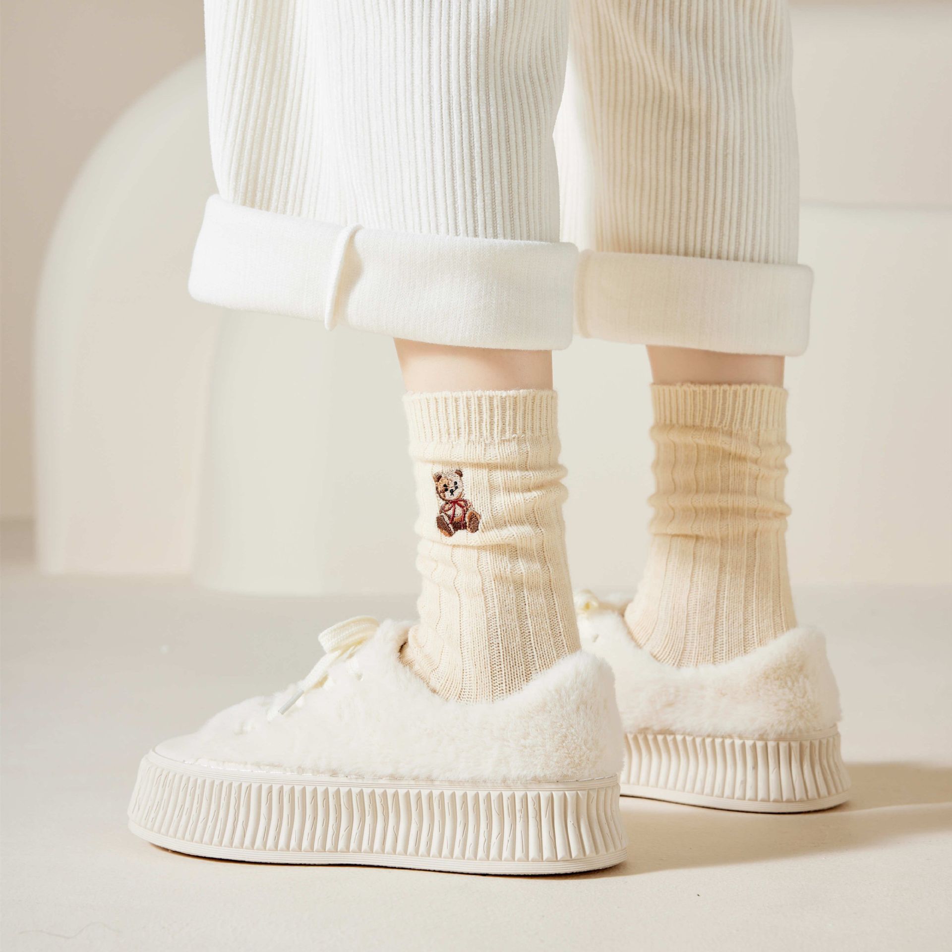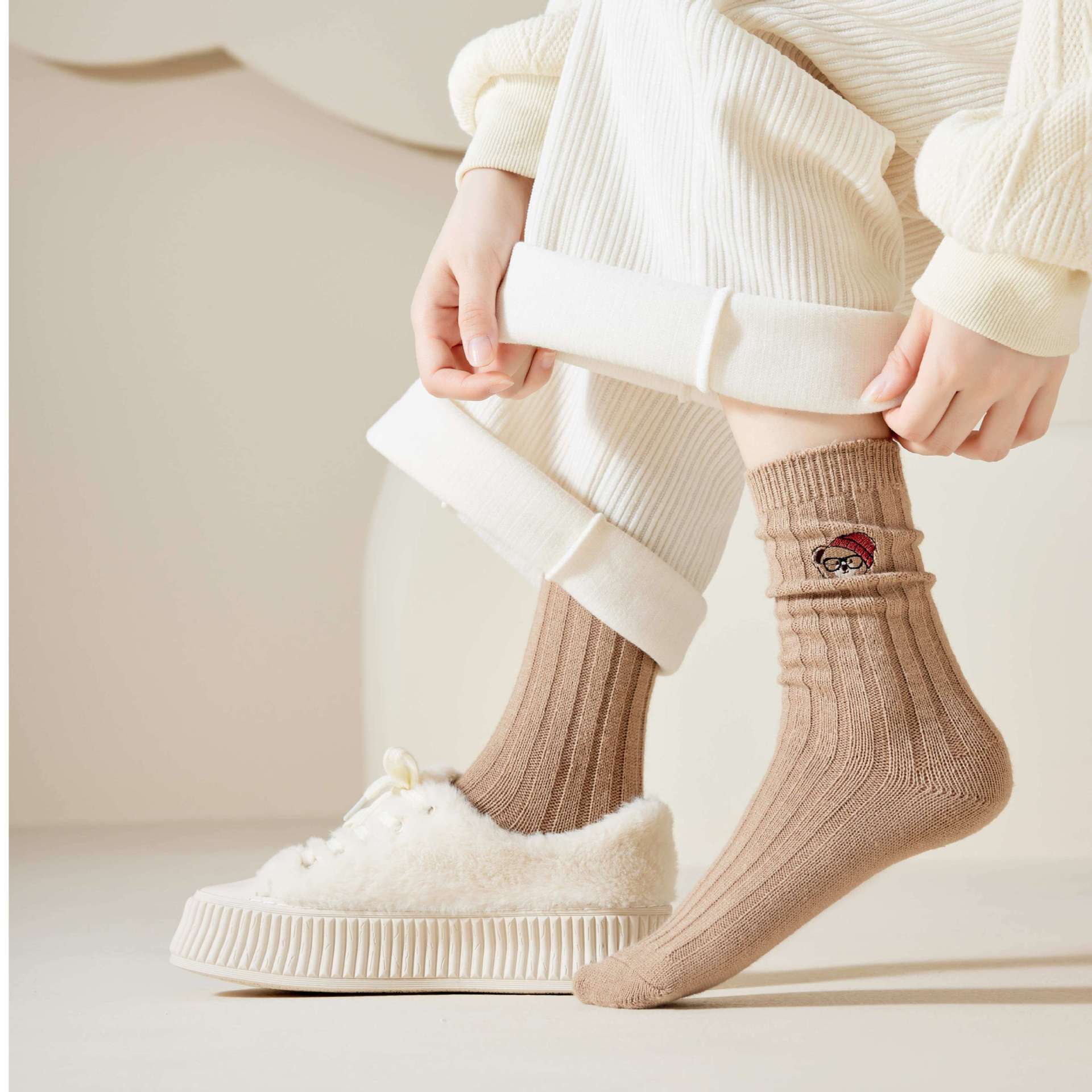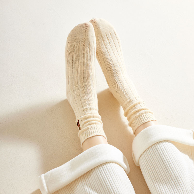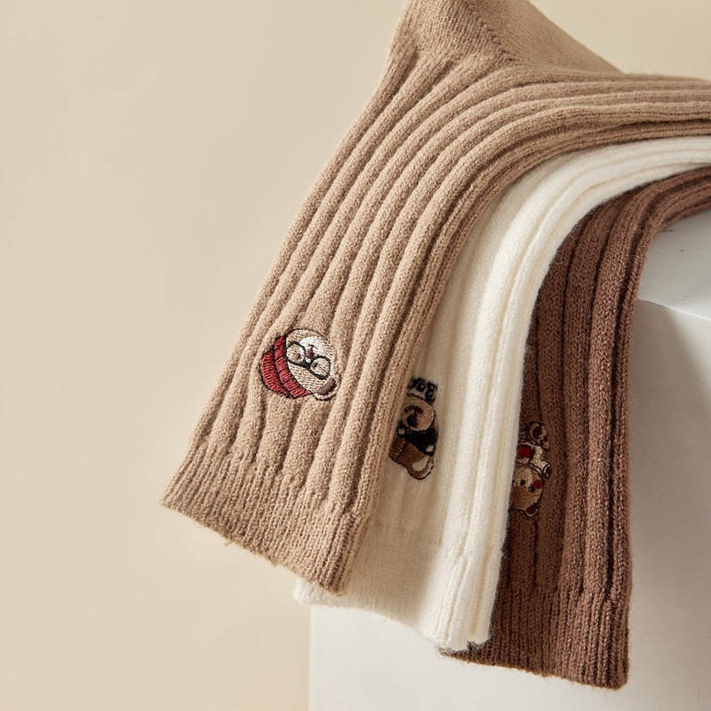 2023 Autumn and Winter New Socks Women's Thickened Mid-Calf Wool Socks Wholesale Ladies Solid Color Cartoon Embroidery Bunching Socks