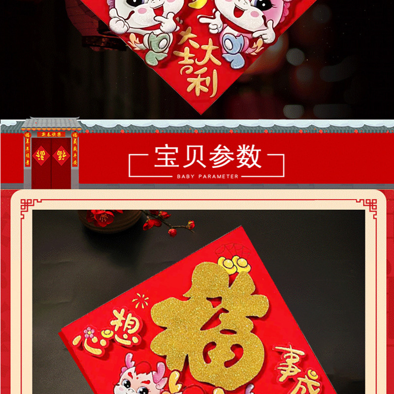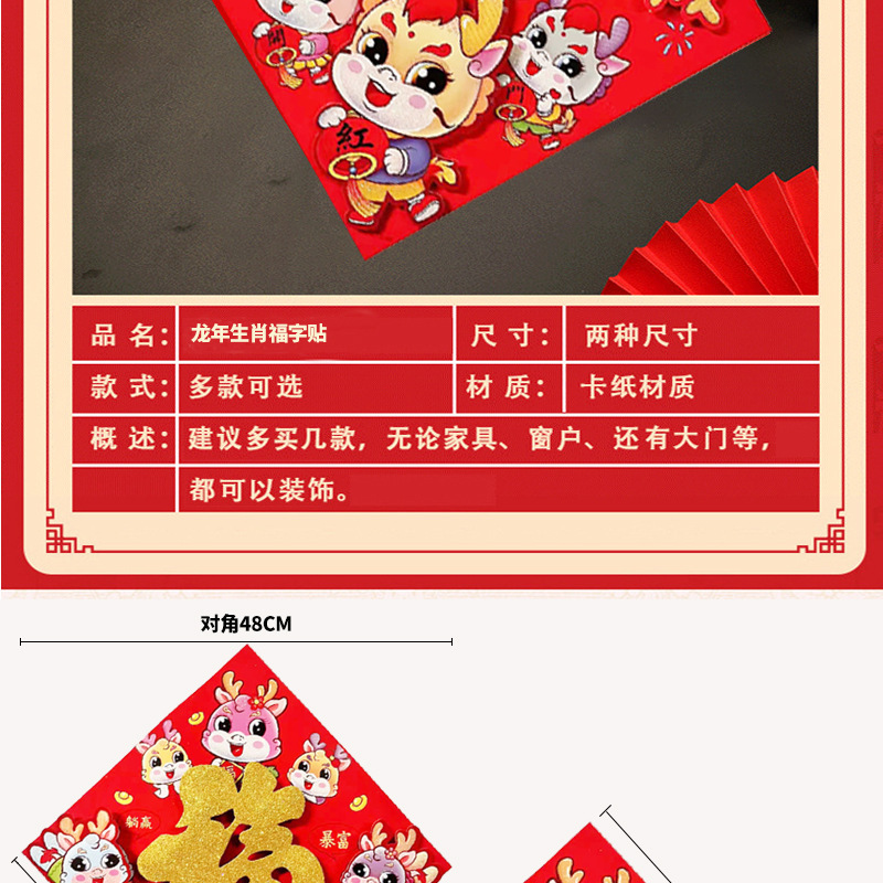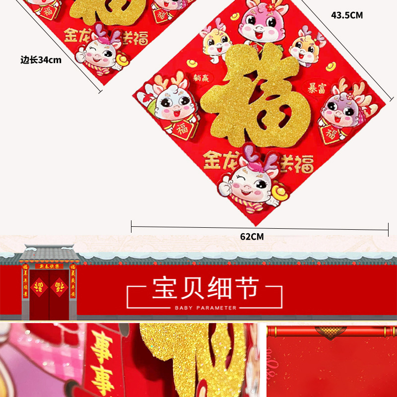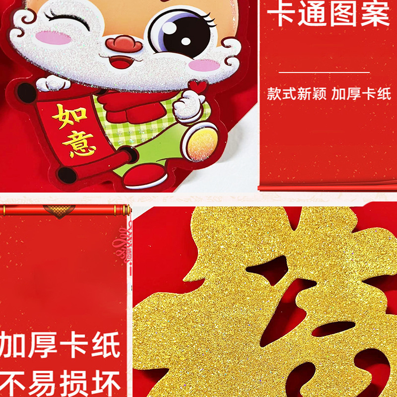 2024 Dragon Year New Fu Character Zodiac Three-Dimensional Flocking Doufang Door Width New Year Decorative Stickers Spring Festival Window Flower Wholesale