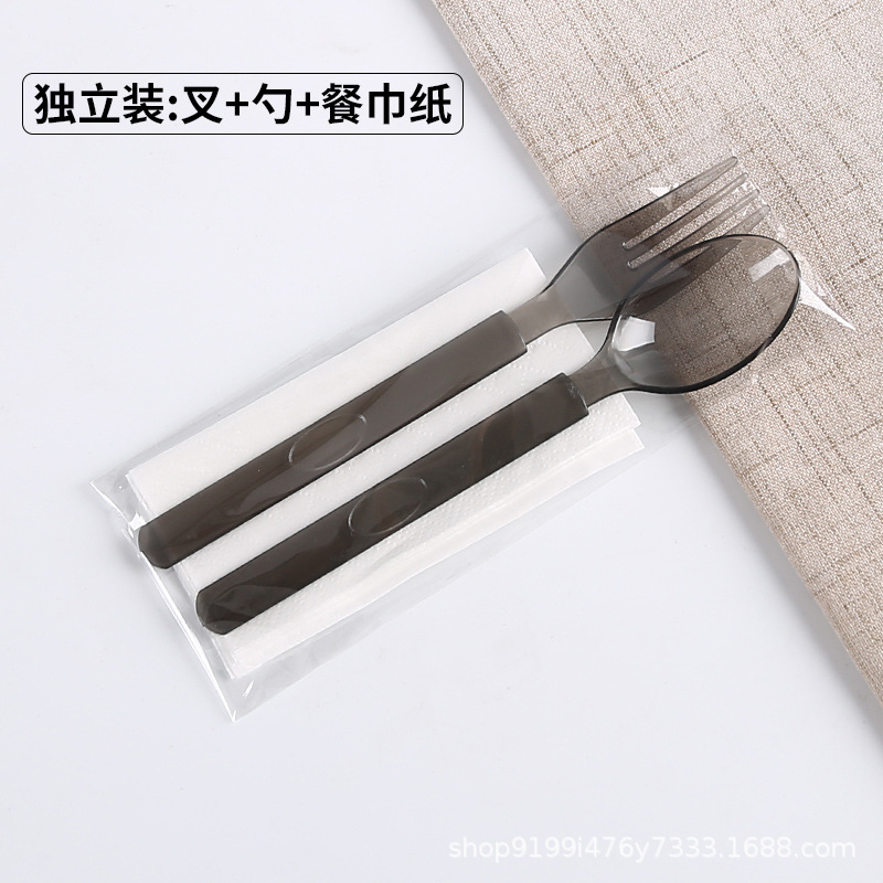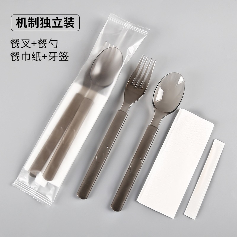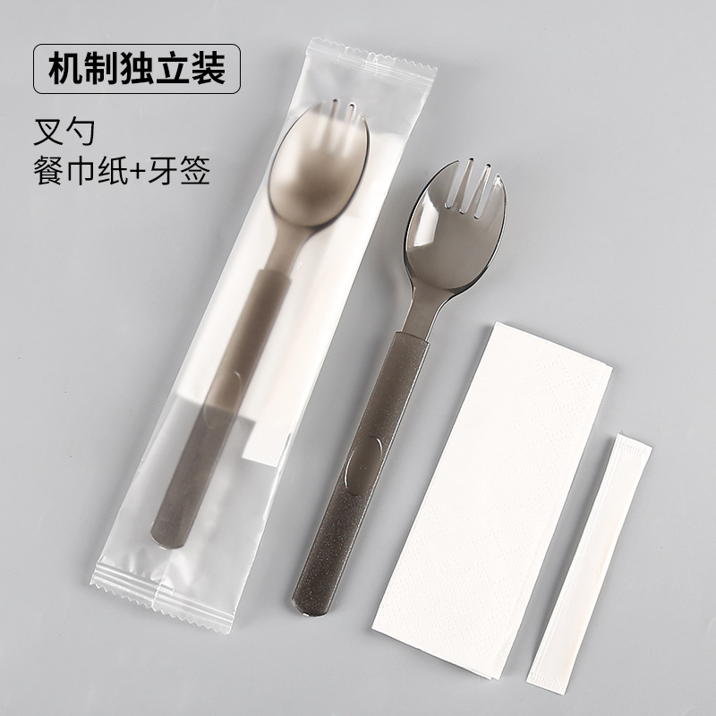 black fork + spoon + tissue + toothpick