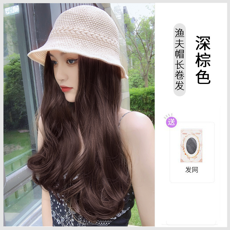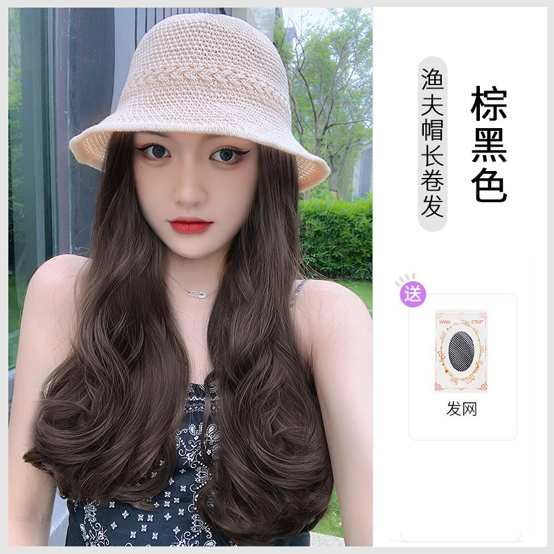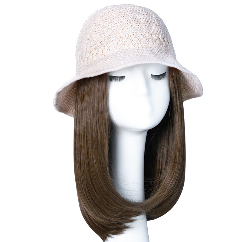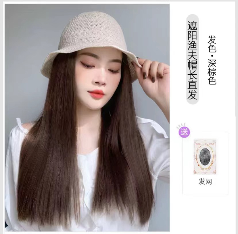 beige mesh bucket hat + dark brown inner buckle mid-length straight hair