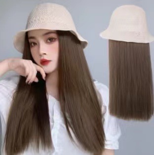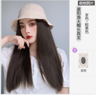beige mesh bucket hat + black brown inner buckle mid-length straight hair