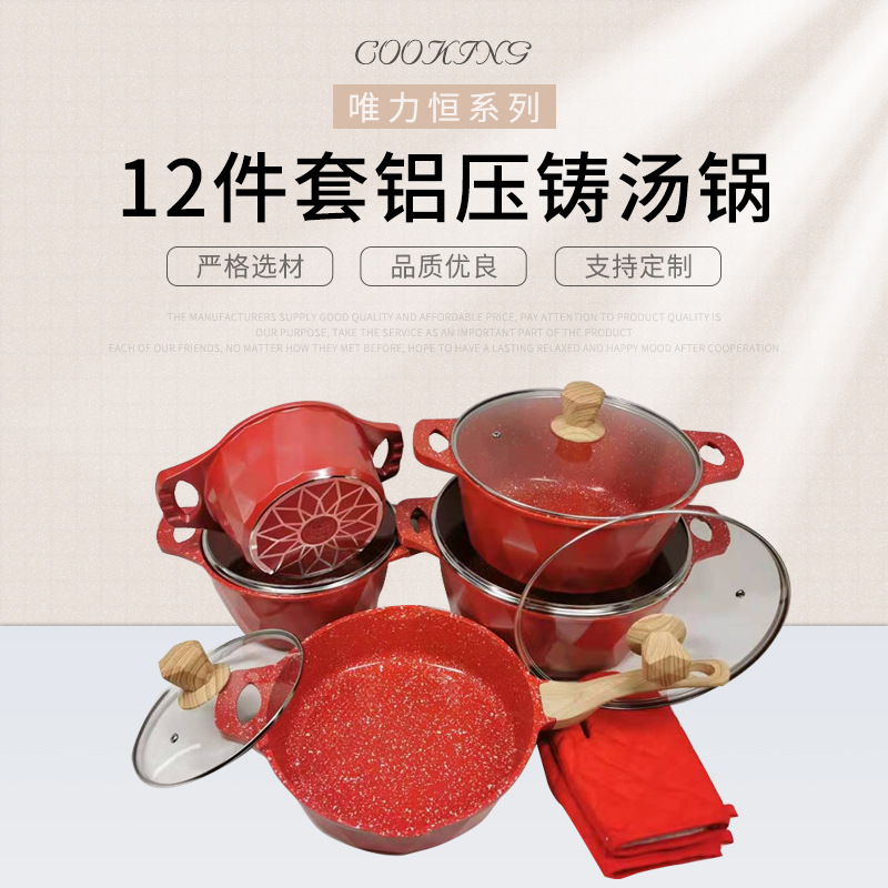 12-Piece Aluminum Die-Cast Soup Pot Household Kitchen Induction Cooker Flat Bottom Wok Gift Pan Set Supply