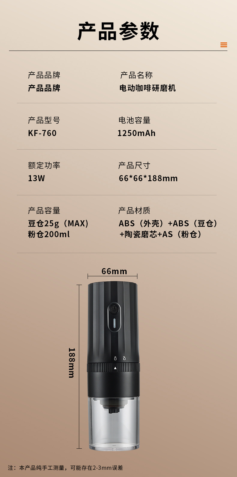 Bean storage capacity: 25 grams/powder tank 200ml