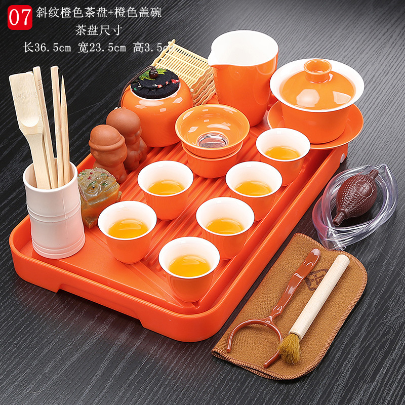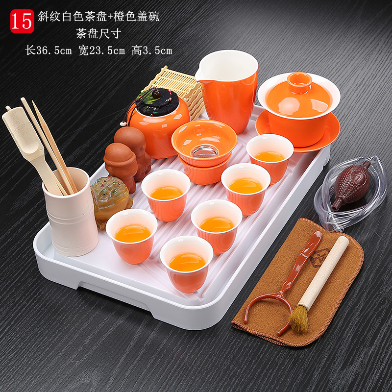bamboo tea tray twill orange + white lidded bowl tea set
