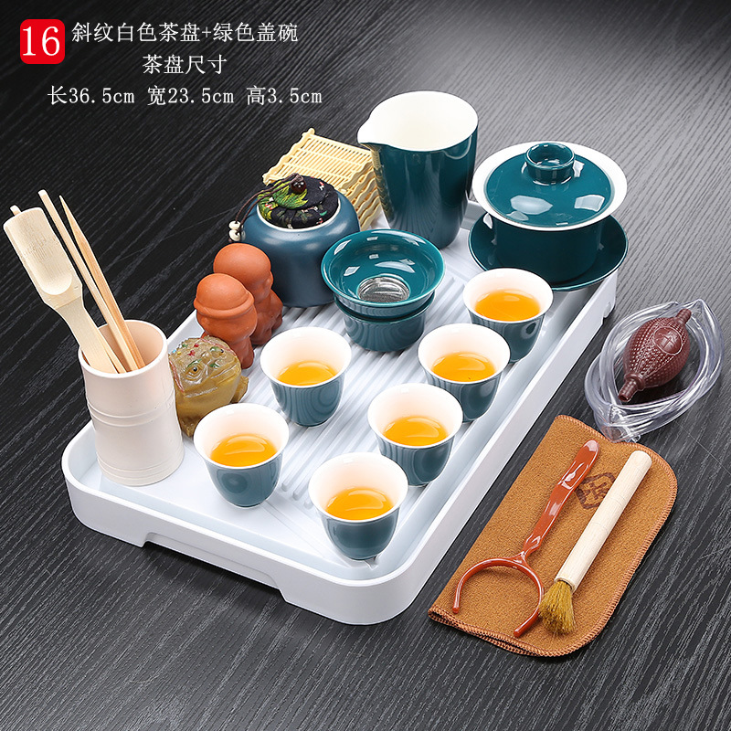 bamboo tea tray twill white + green lidded bowl tea set
