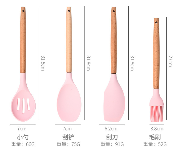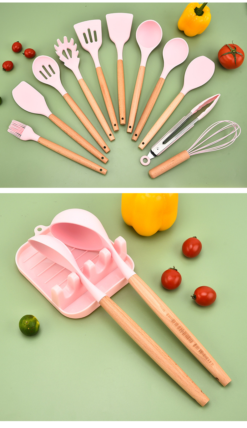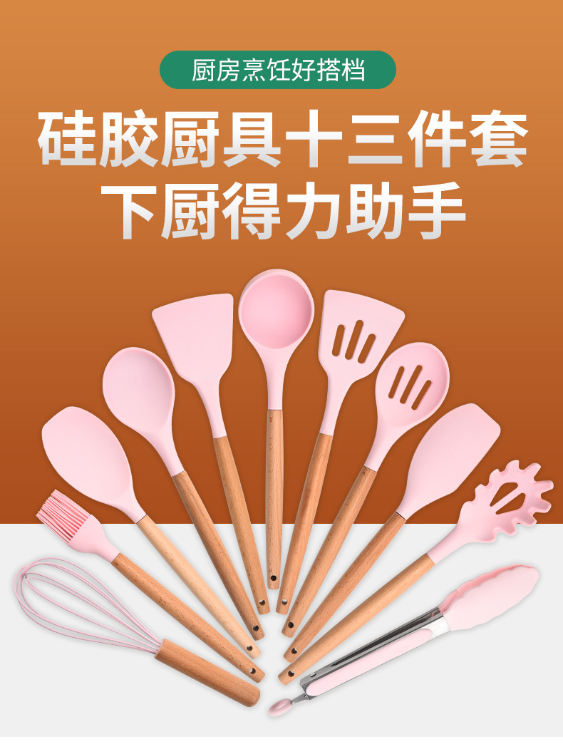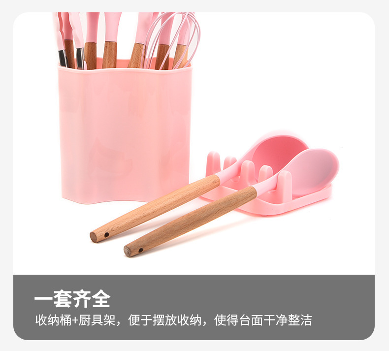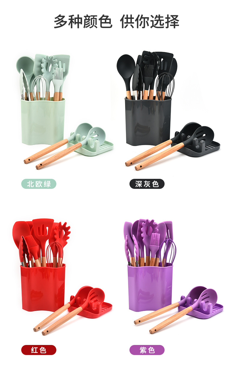 wooden handle silicone square bucket kitchenware 13-piece silicone spatula kitchen utensils silicone kitchenware set