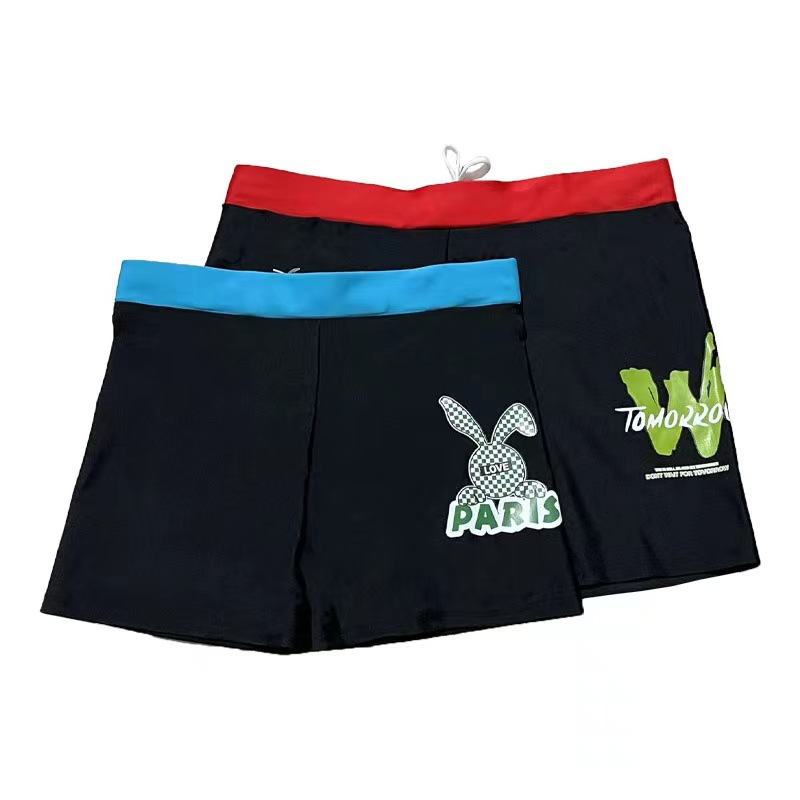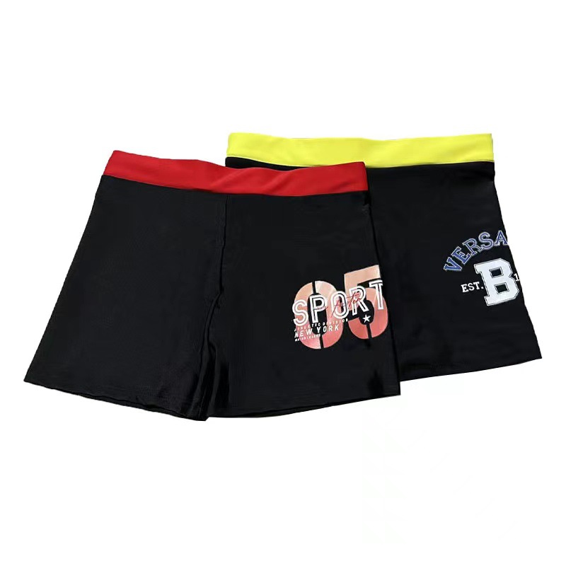 Youth swimtrunks made of ultra-fine polyester yarn, with a good feel and high elasticity. Available in two sizes: small for weights 50-80 pounds, large for weights 80-120 pounds. A package contains 10 pieces, with a mix of single-color and patterned designs.
