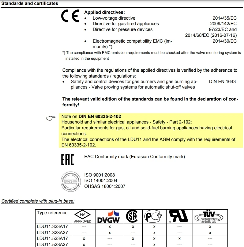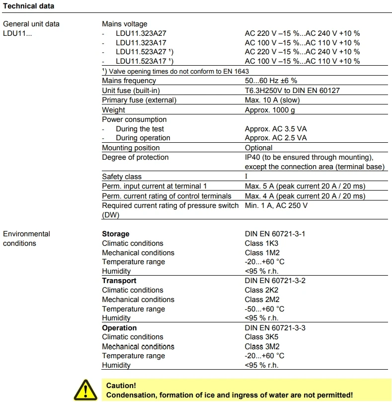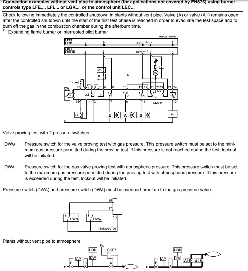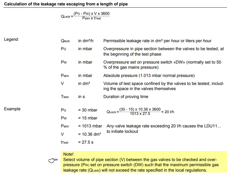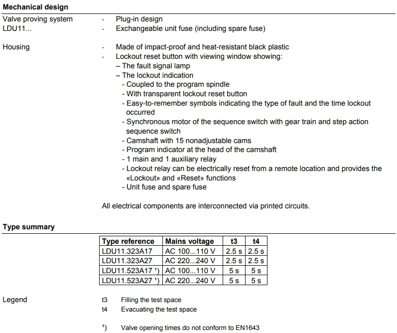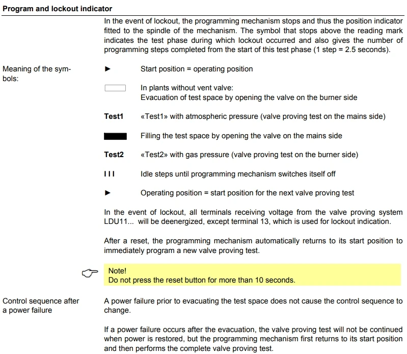 completion of the burner control’s control sequence, e.g. at the end of the postpurge time The valve proving test is based on the 2-stage pressure proving principle: 1. The valve on the mains side is tested by evacuating the test space and by monitoring the atmospheric pressure in it. 2. The valve on the burner side is checked by pressurizing the test space and by monitoring the gas pressure. If the pressure increases excessively during the first test phase called «Test1», or decreases excessively during the second test phase called «Test2», the LDU11.... will inhibit burner startup and initiate lockout. In that case, the lockout reset