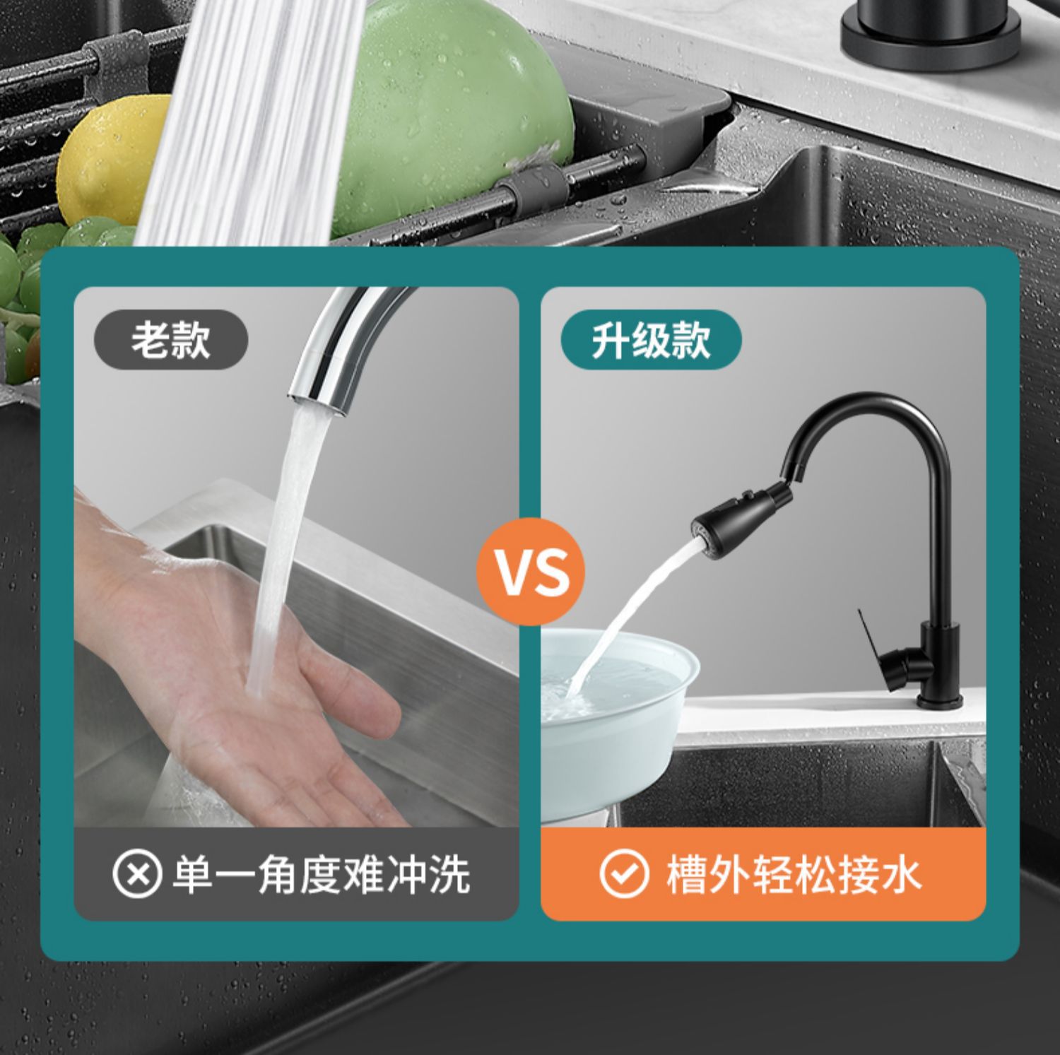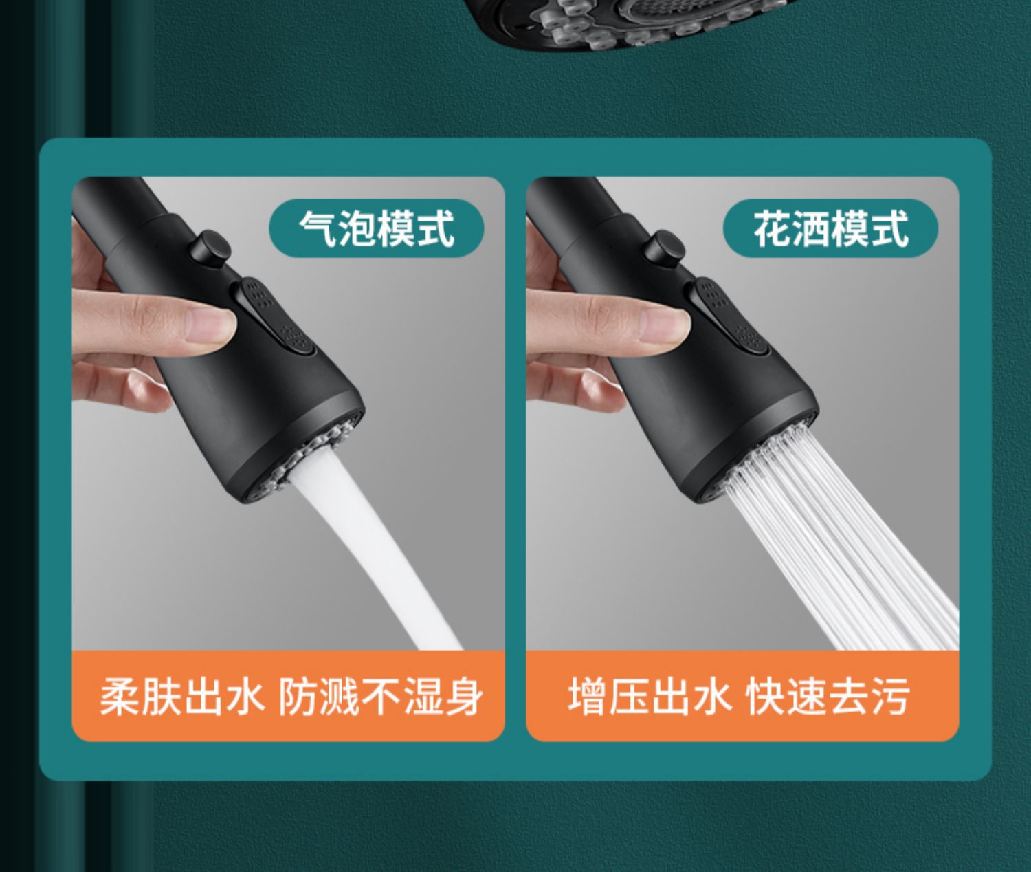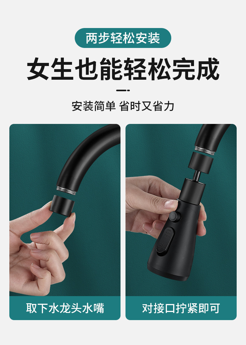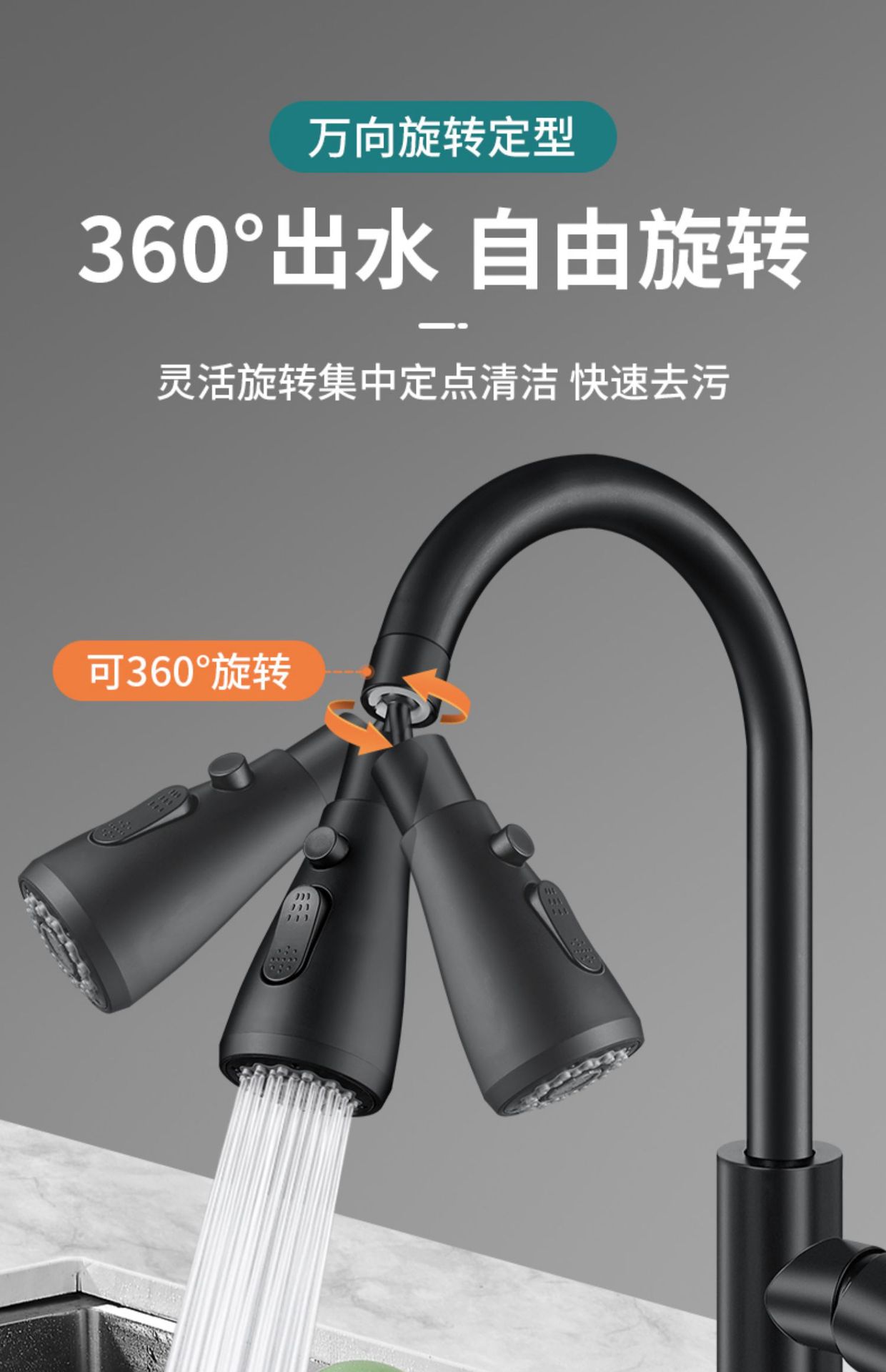 standard water outlet – 360-degree rotation ● boost pressure with splash guard (waterfall black)