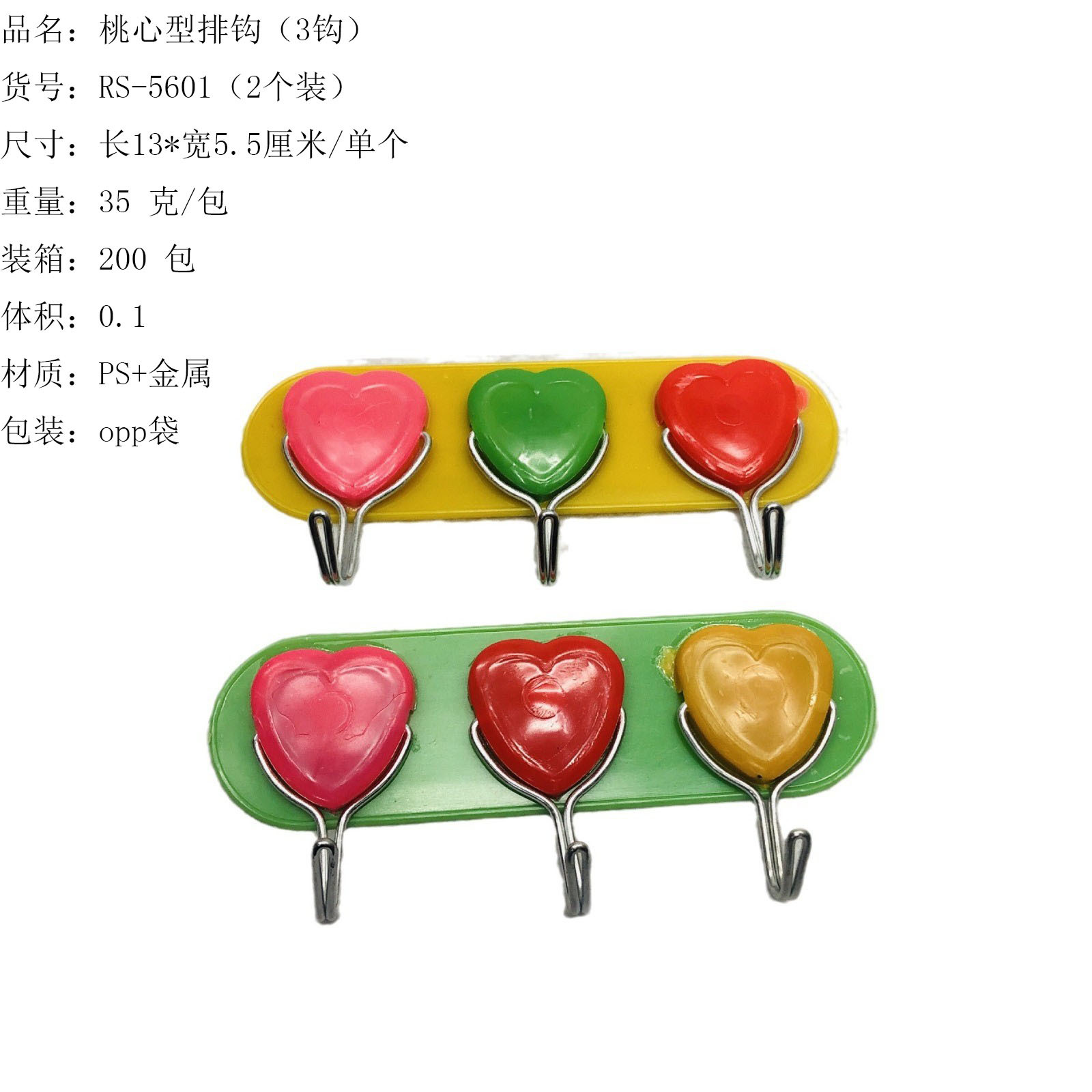 ITEM NO.【Product Model Number】: RS-5078 NAME【Product Name】: Cartoon Row Hooks (3 Hooks) QTY【Quantity】:600 pieces "CBM【Carton Volume】:0.12 Material【Product Material】: PP+Metal+Adhesive Color: Mixed Weight: 27 grams Packaging【包装方式】:opp袋 "W.G【Gross Weight of a Full Container】:17.5kilogram