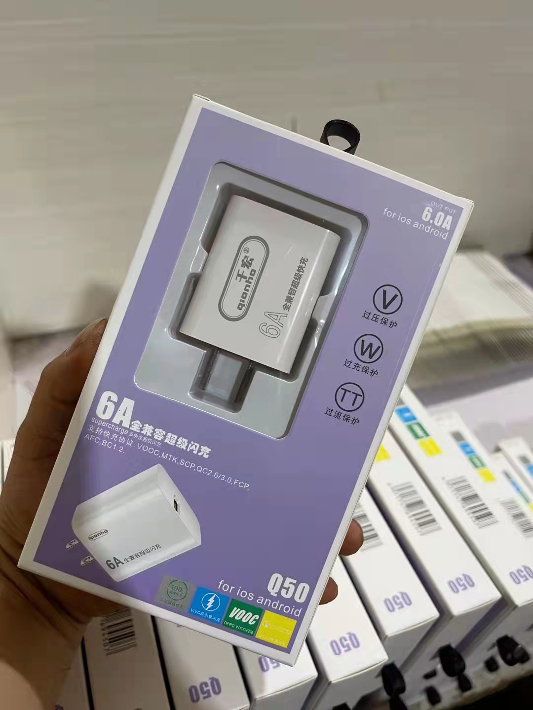Qianhong Brand Mobile Phone Charger,Q50It is a single fast charging flash charger with packaging box, not including a data cable.Q51Android6ACharger KitWith a beautiful packaging box, charger, and data cable together.Q52Huawei Wide-MouthData cable for fast charging, charger, and packaging box.Supports fast charging.Q53 AppleWrap the data cable and charger together, business phone 13735754314