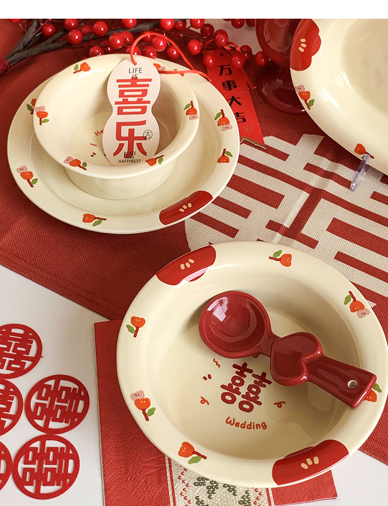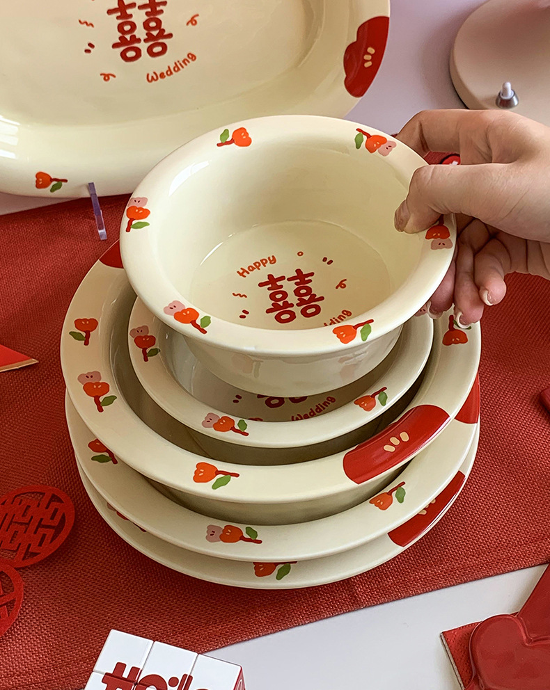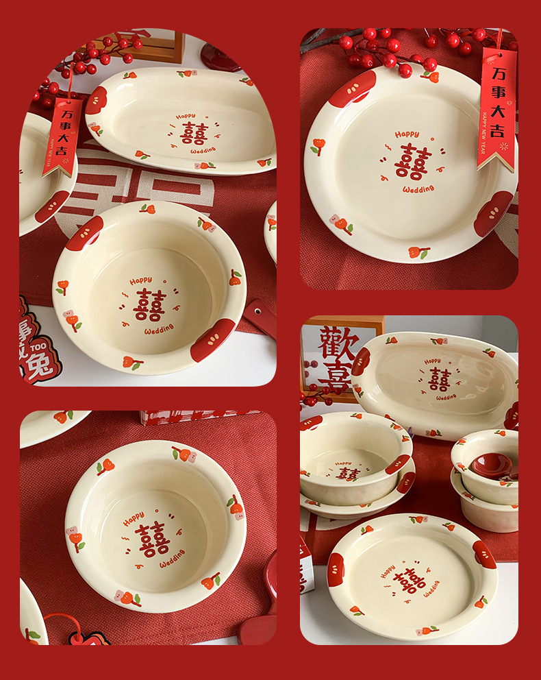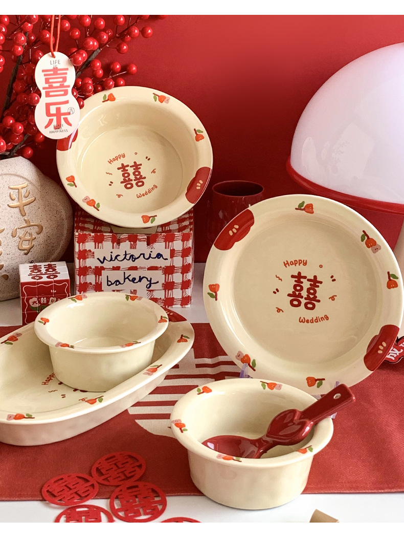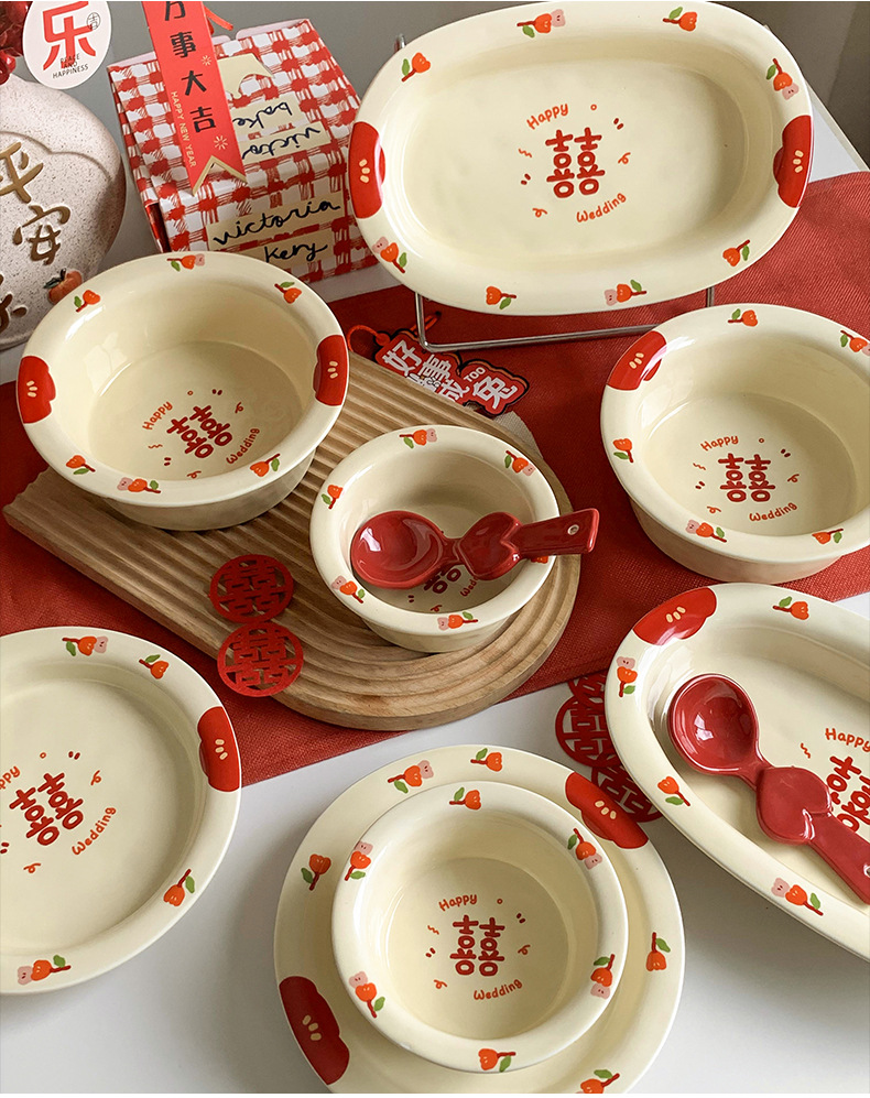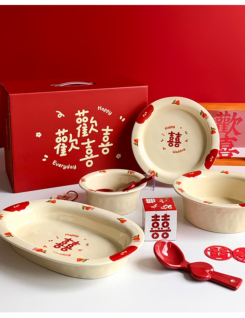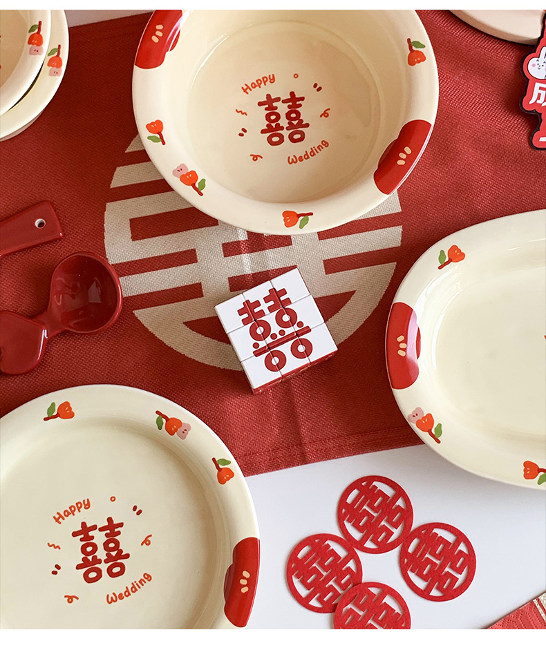 Double Xi Character Engagement Gift Chopsticks Tableware Set for New Couple Ceramic Girlfriends Dowry for Bride Rice Bowls and Chopsticks Combination
