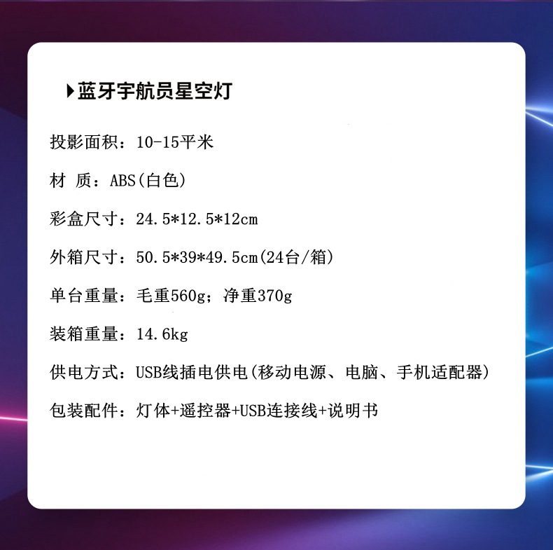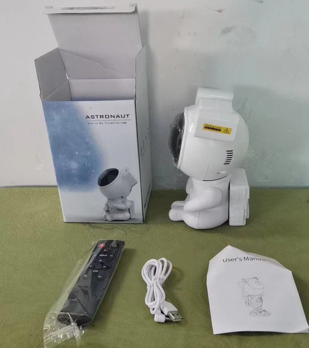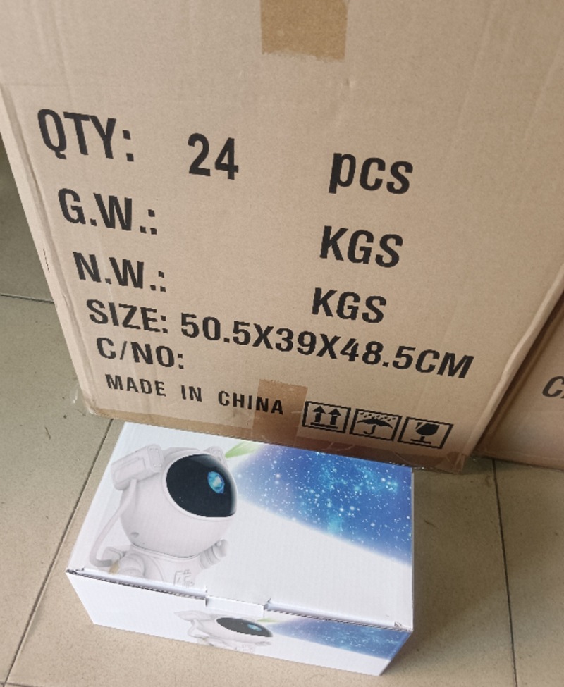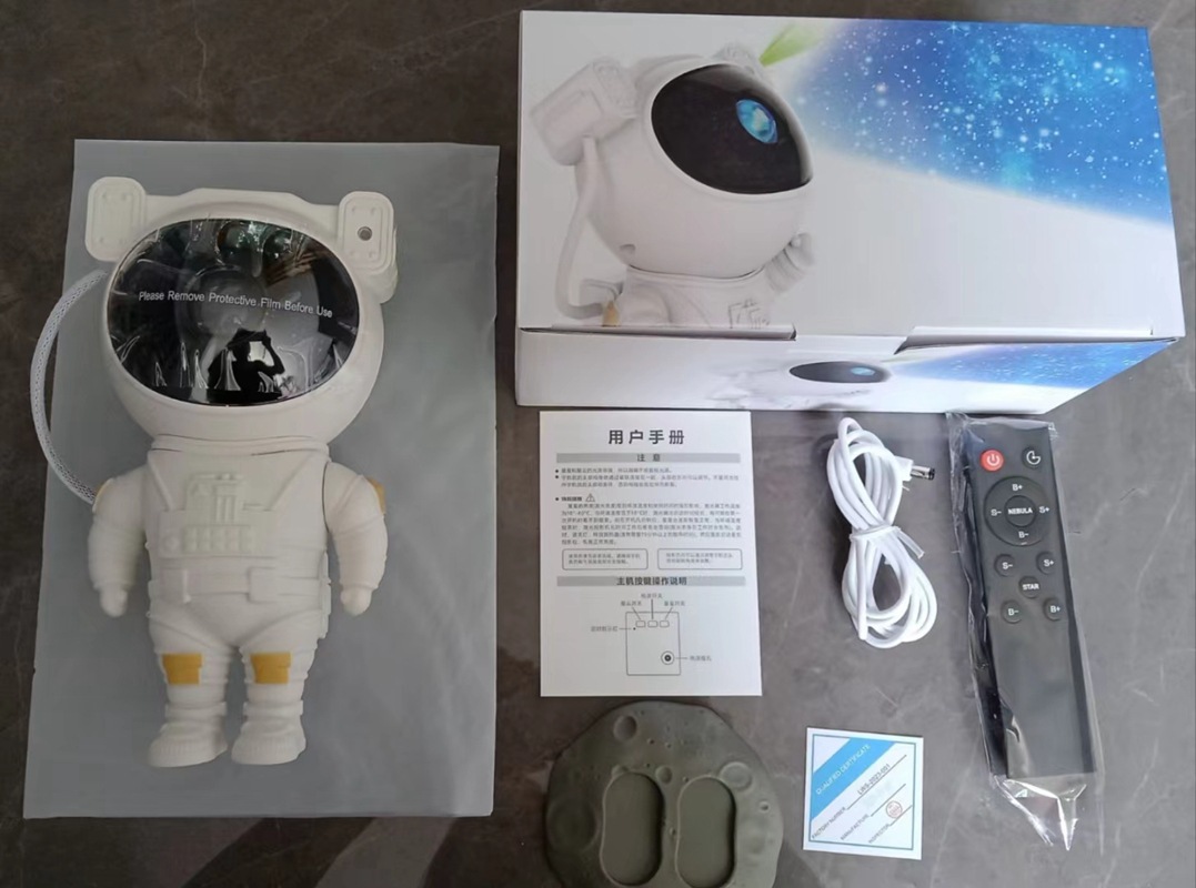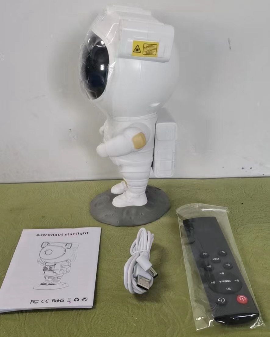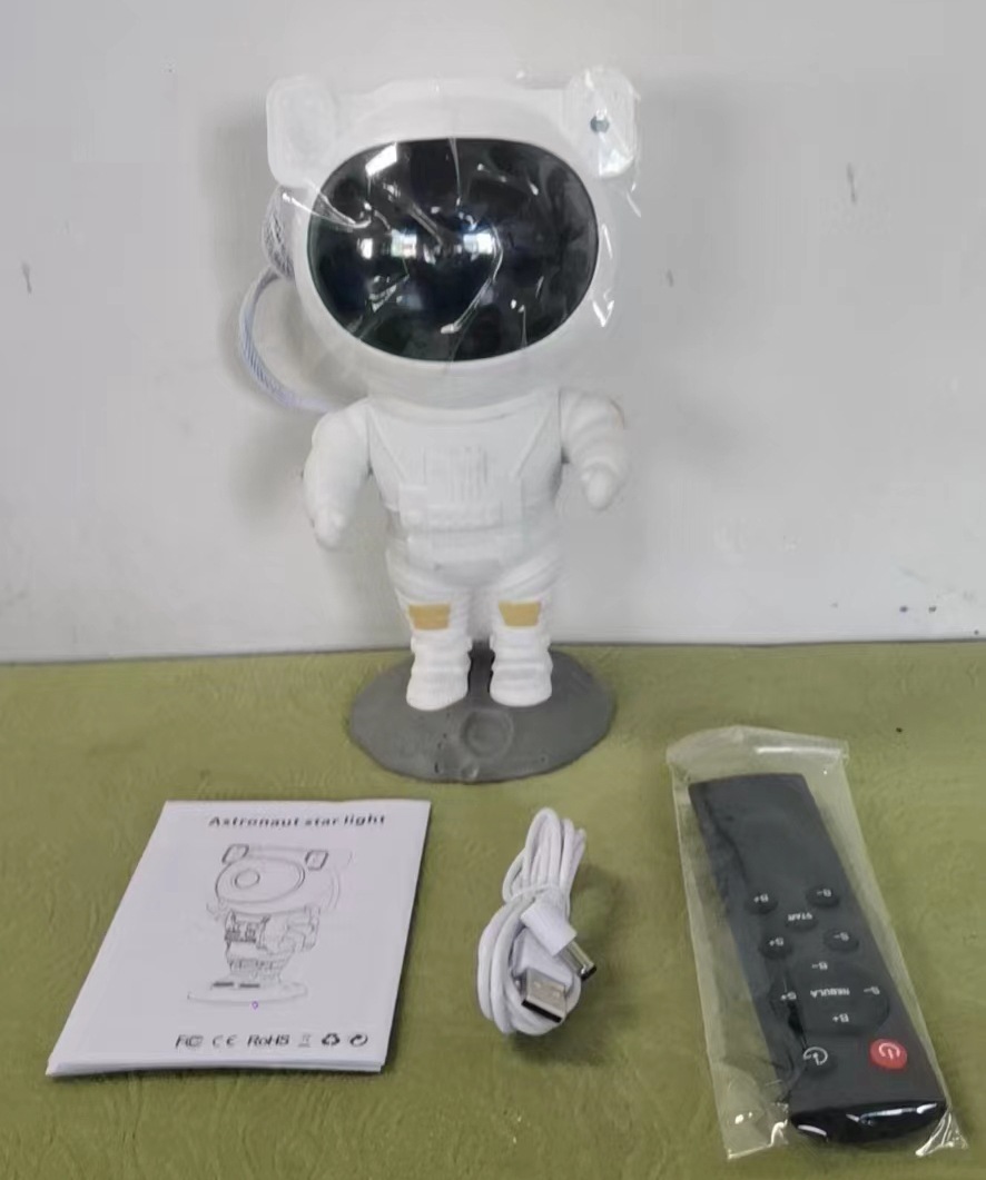 Product standard configuration: Astronaut Projector Light * 1; Base * 1; USB Power Cable * 1; English Instruction Manual * 1; Remote Control * 1 (requires 2 AA batteries, batteries are not included in the shipment).