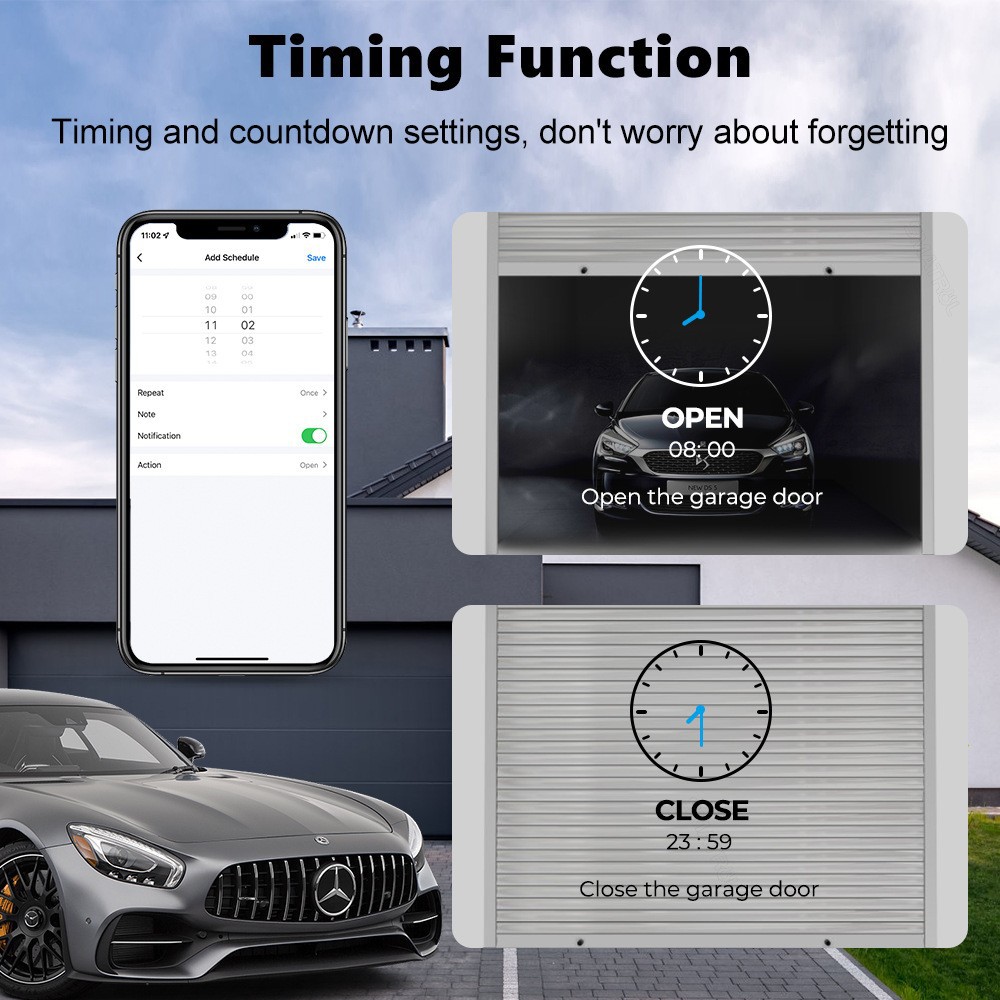 Timers: Based on your need to leave or return home, you can set appropriate timers to trigger the opening/closing of the garage door, using a smart garage door remote to create a smarter lifestyle.