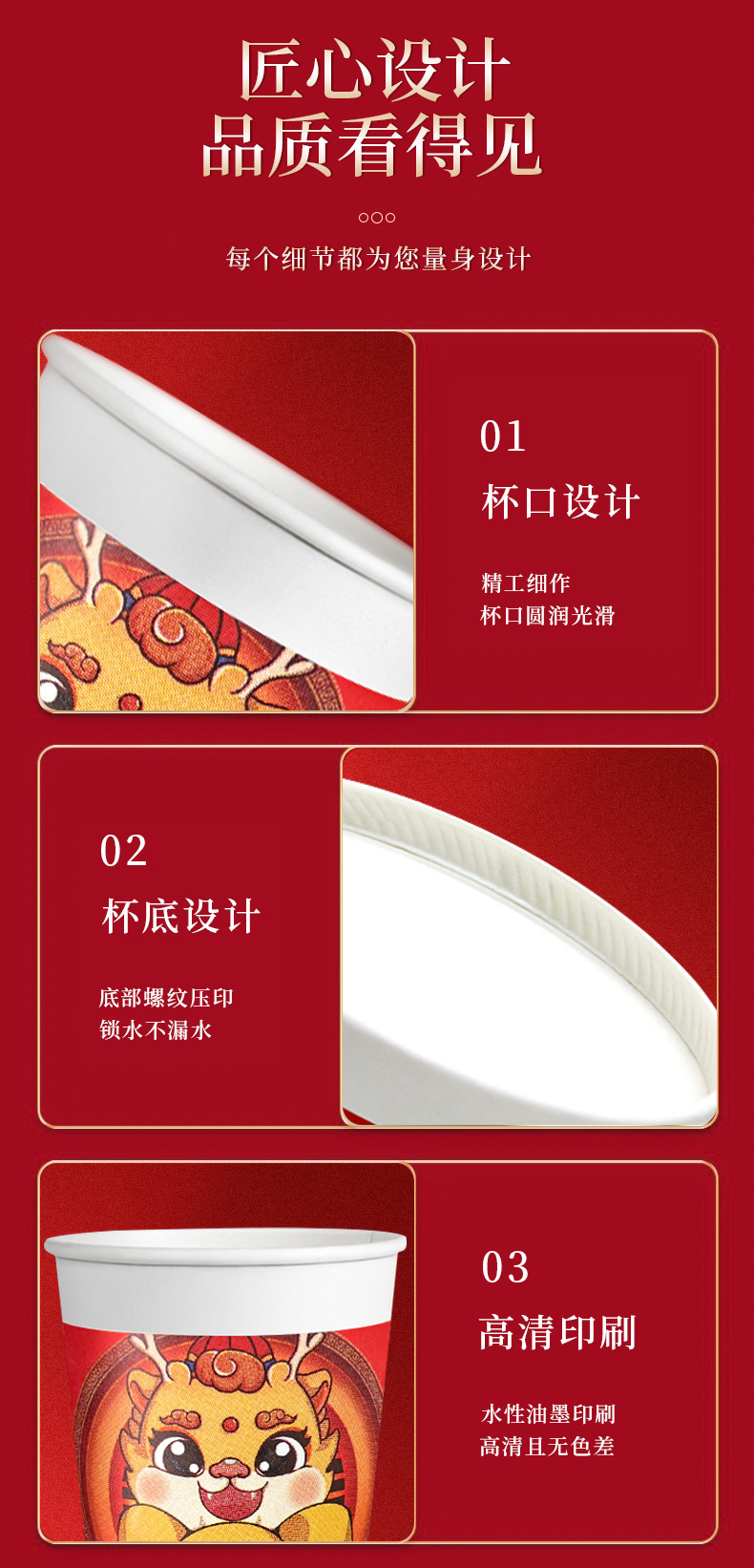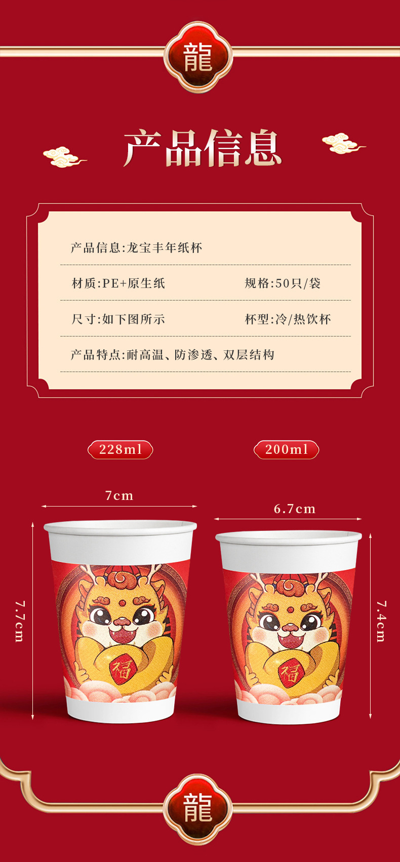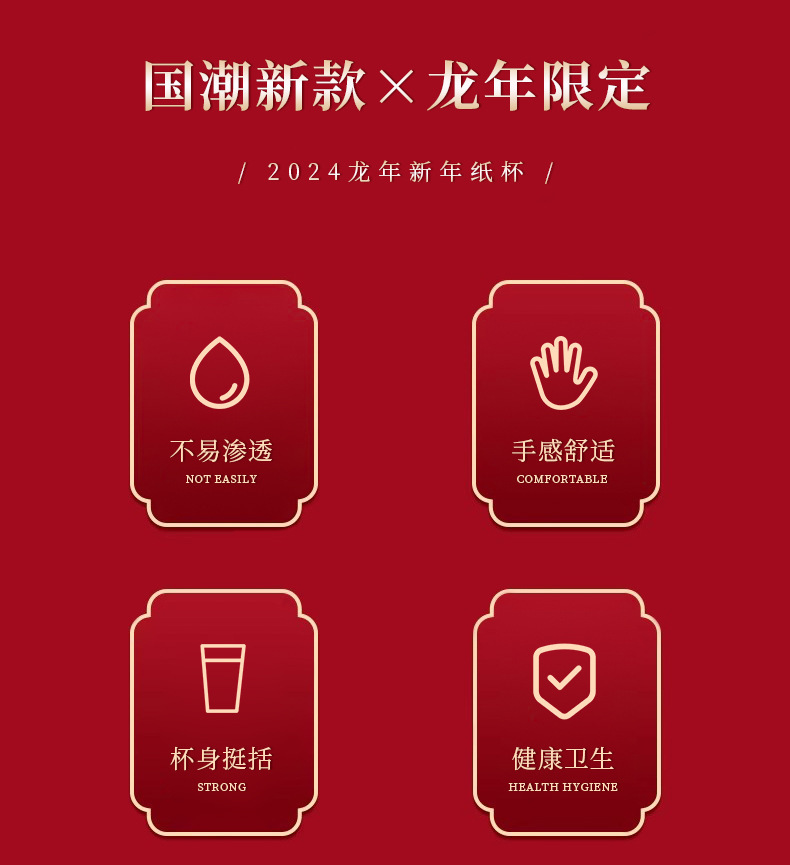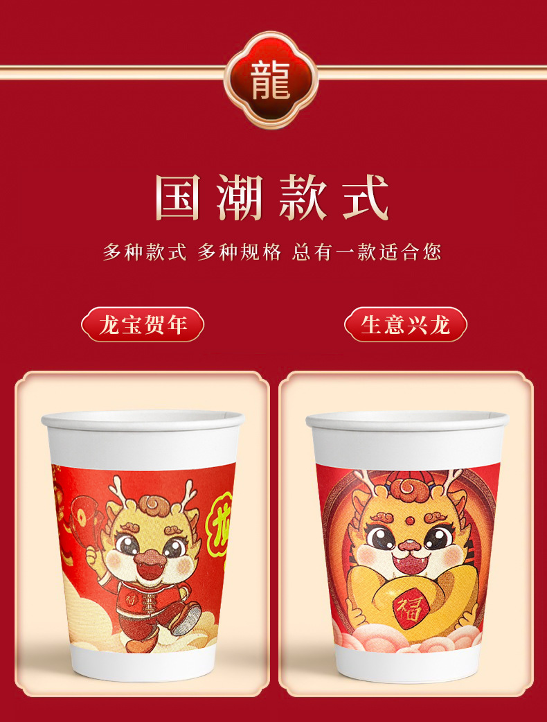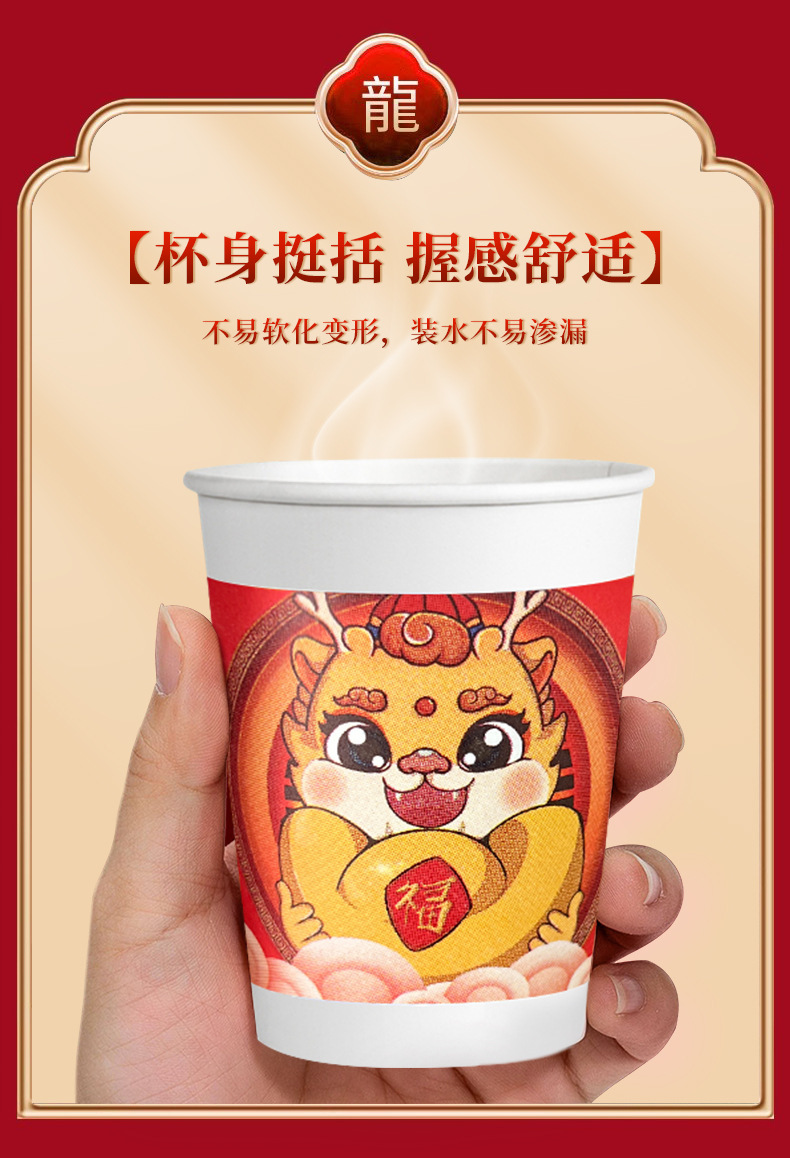 2024 Dragon Year Spring Festival Disposable Paper Cup Dragon Year New Year Wedding Home Thickened Water Cup National Fashion Dragon Year Paper Cup