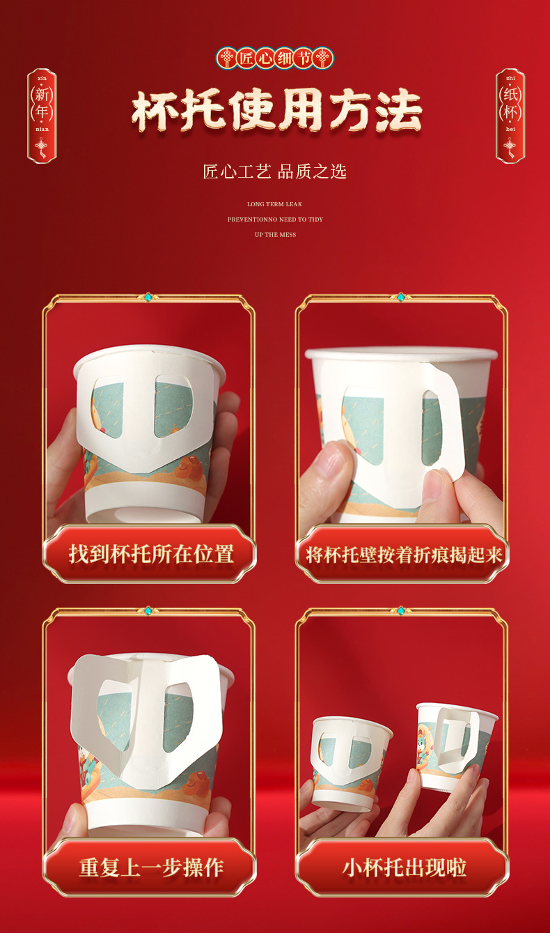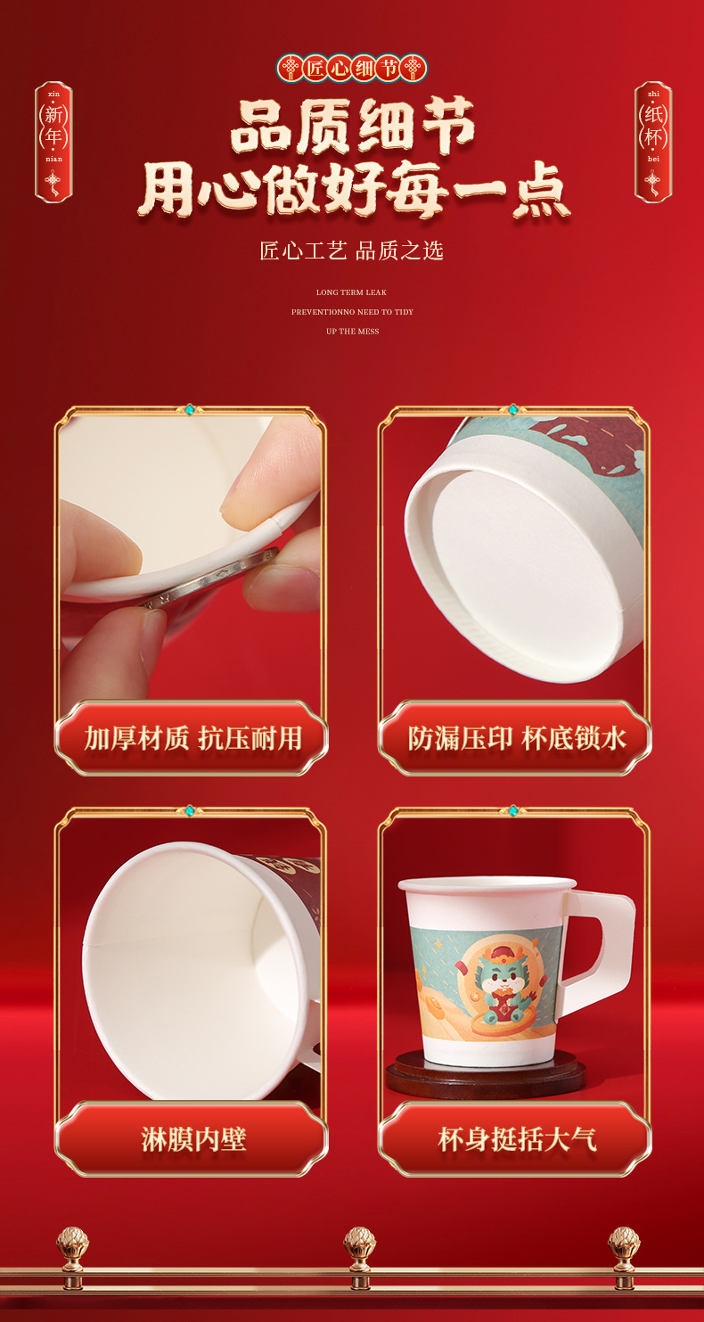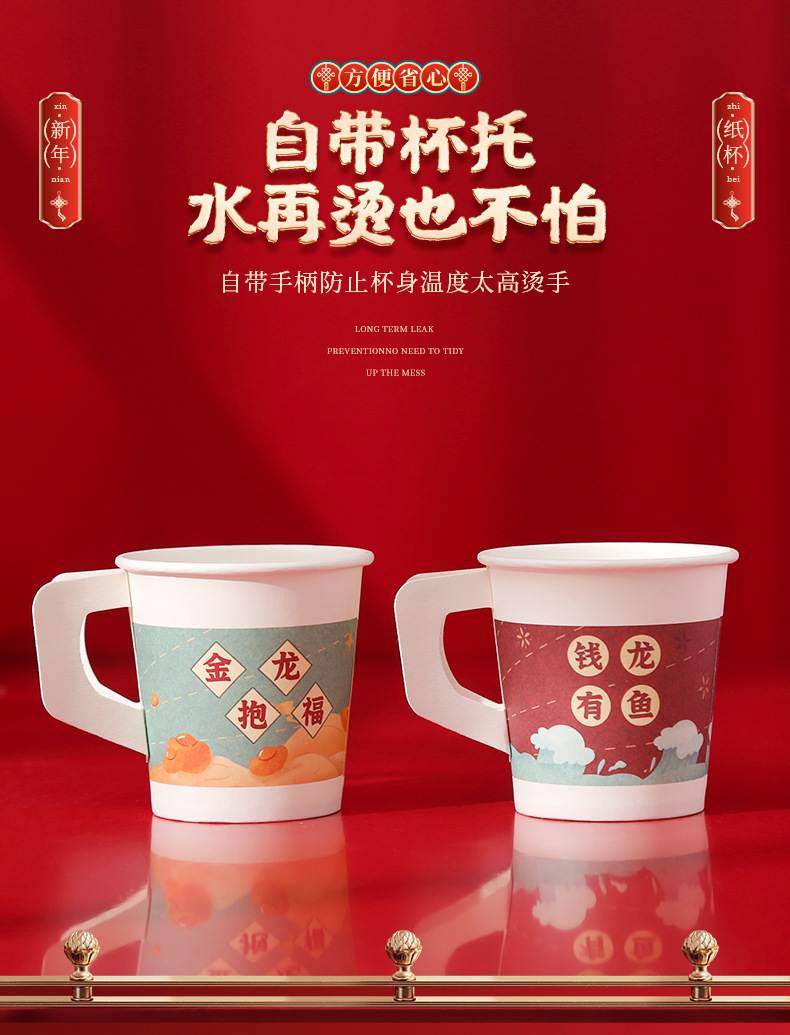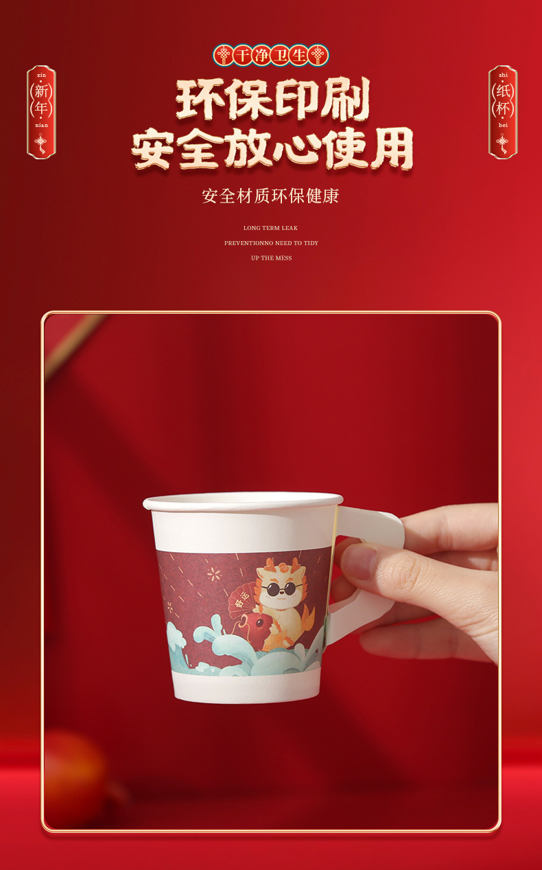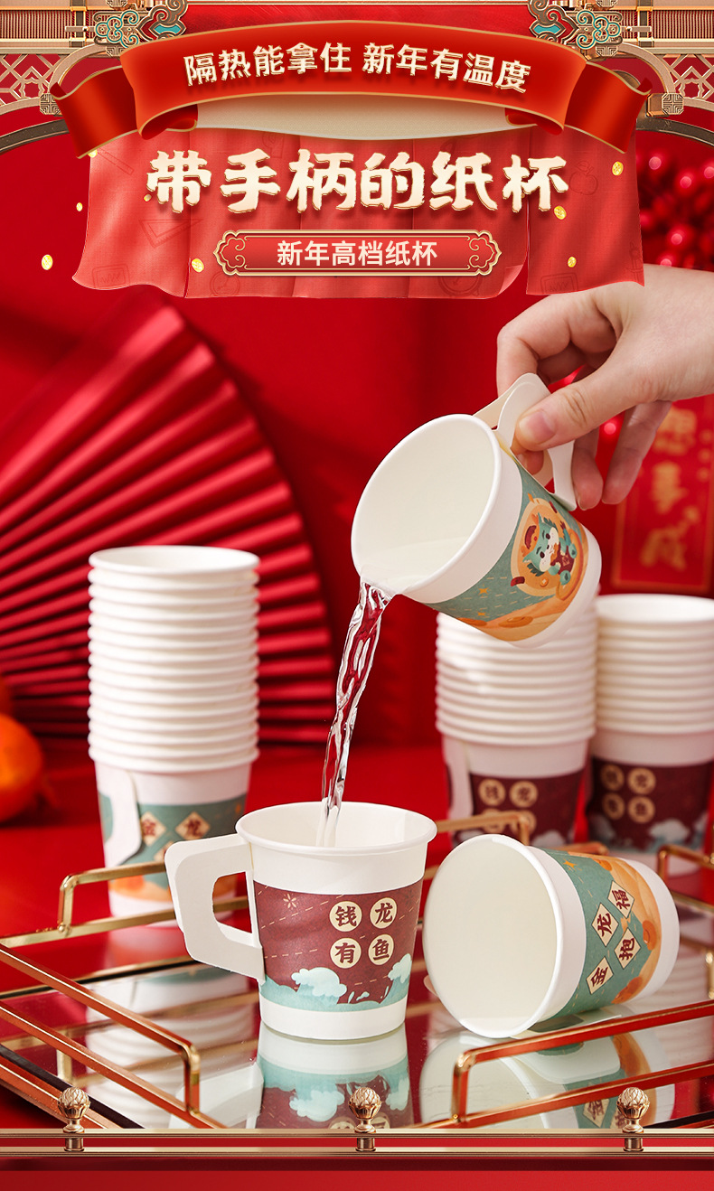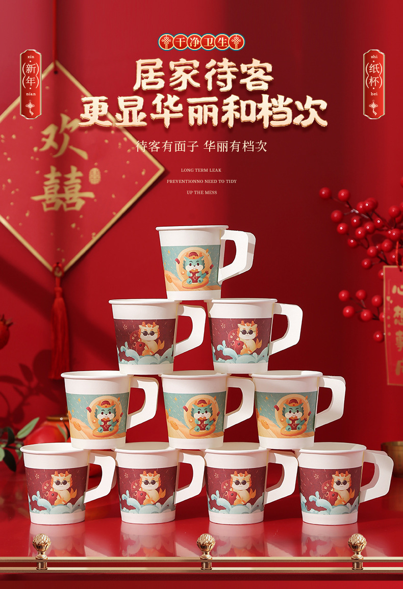 2024 Dragon Year Cartoon Paper Cup New Disposable Spring Festival and New Year's Day Thickened and Anti-Scald Festive New Year Cup with Handle